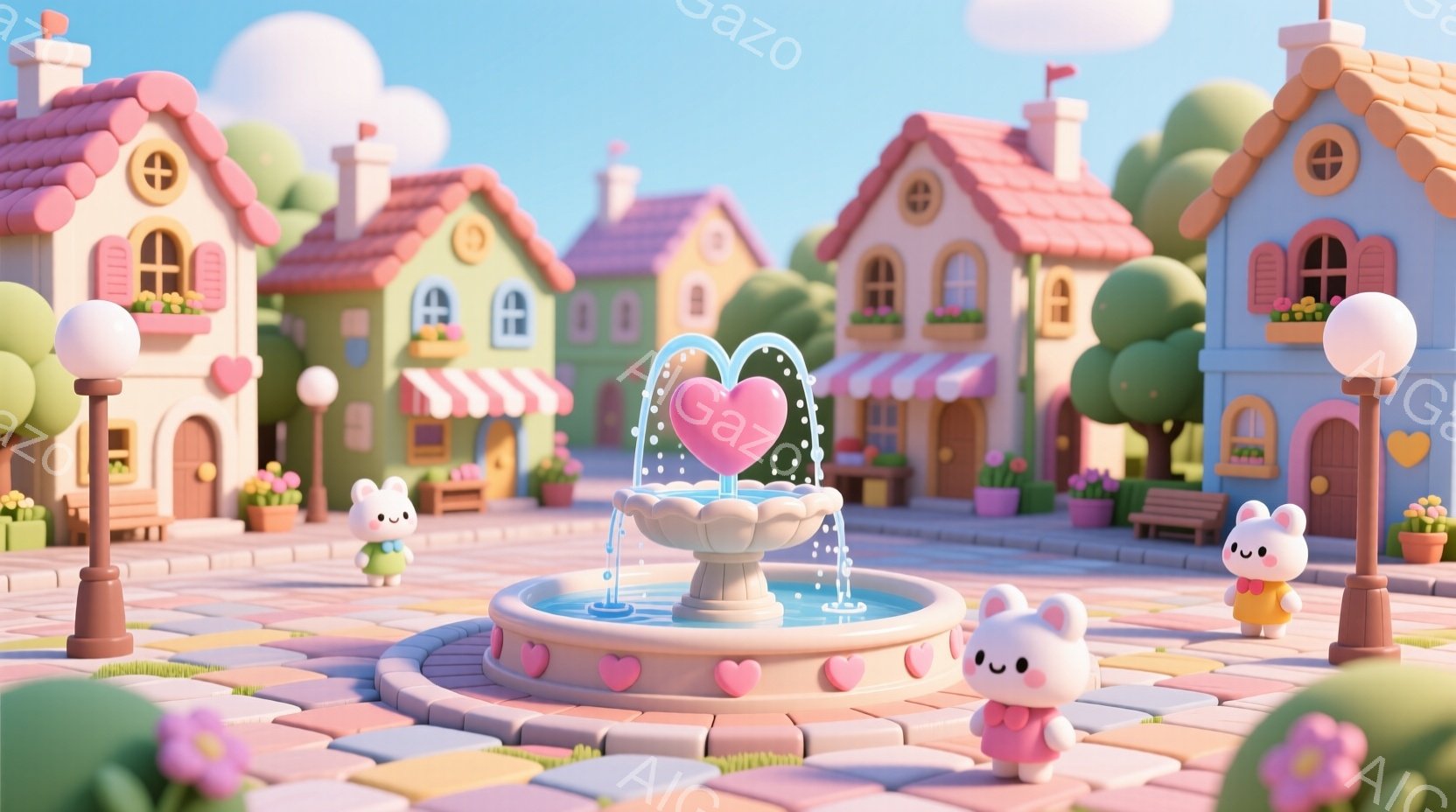 柔らかいパステルカラーで描かれた可愛らしい街並みで、丸いフォルムのキャラクターたちが噴水を取り囲んでいます。キャラクターたちはそれぞれ異なる色の服を着ており、ピンクのリボンや帽子を付けています。背景にはカラフルな家々が並び、天候は晴れで、全体的に暖かく、遊び心のある雰囲気が漂っています。