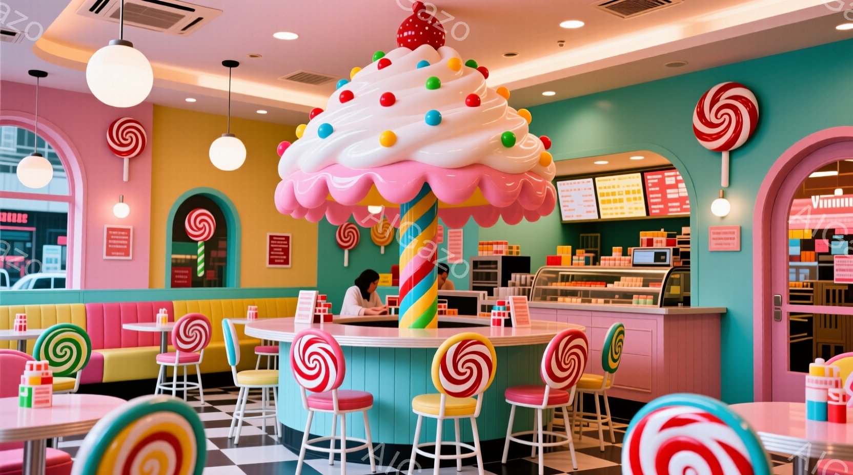 この無料AI生成画像「広大な緑の芝生の上に、カップケーキのような可愛らしい建物が建っています。建物はピンクと白のストライプで覆われ、大きな赤いチェリーが頂上に飾られています。周囲にはカラフルな椅子とテーブルが並び、キャンディケーンのような柱が建物の両側にそびえ立っており、夢のようなお菓子の国のような雰囲気です。」は、2025年10月23日に作成されました。 サイズは 1664×928px の高解像度で、商用利用も可能なフリー素材として提供しています。
