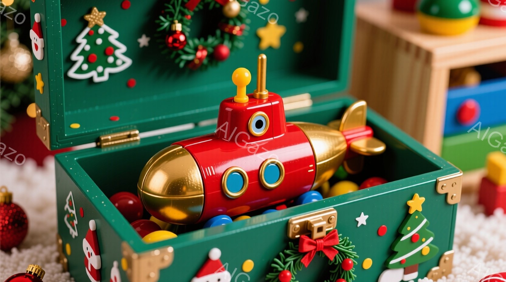 赤い潜水艦のおもちゃが、クリスマス柄の箱の中に置かれています。箱は緑色を基調とし、サンタクロースの絵やリボン、クリスマスツリーのイラストが描かれており、金色の装飾がアクセントになっています。背景には、ぼやけたクリスマスツリーとプレゼントが見え、お祝いムードが漂っています。
