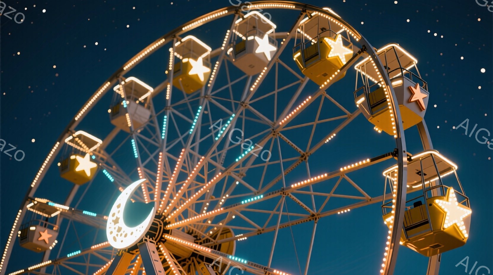 夜空を背景に、ライトアップされた観覧車が鮮やかに輝いている。各ゴンドラには星形と月形の装飾が施され、カラフルなLEDライトが観覧車の輪郭を彩っている。暗闇の中に浮かび上がる観覧車は、夢幻的でロマンチックな雰囲気を醸し出している。
