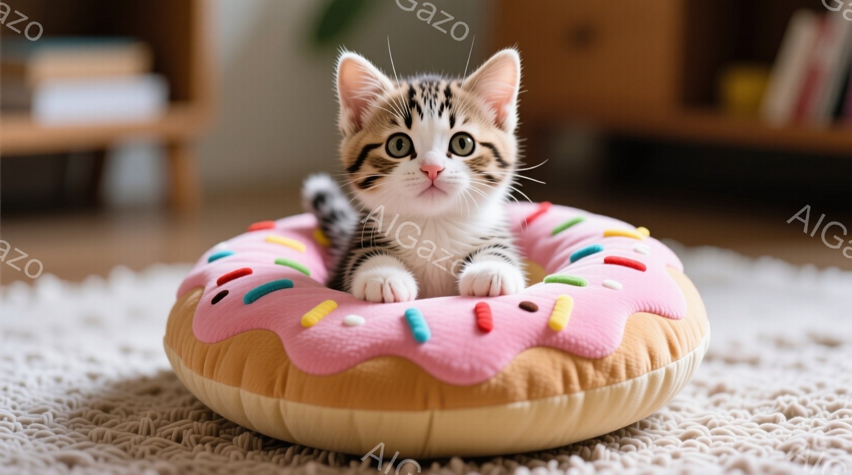 白と黒の縞模様の小さな子猫が、ピンク色のアイシングとカラフルなスプリンクルが施されたドーナツ型のベッドに丸まって座っています。子猫は前足を伸ばしてリラックスした表情で、好奇心旺盛な眼差しで正面を見ています。背景はぼやけた茶色のラグで、全体的に暖かく、遊び心のある雰囲気です。