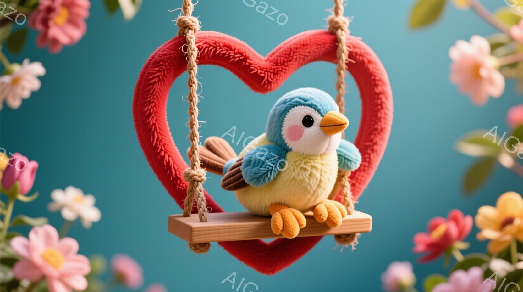 ふわふわした青い鳥が、赤いハート型のブランコに座っています。鳥は小さなオレンジ色の足で木製の板にしっかりと掴まり、穏やかな表情を浮かべています。背景には、ピンクと白の花が咲き乱れ、明るく優しい春の雰囲気を作り出しています。