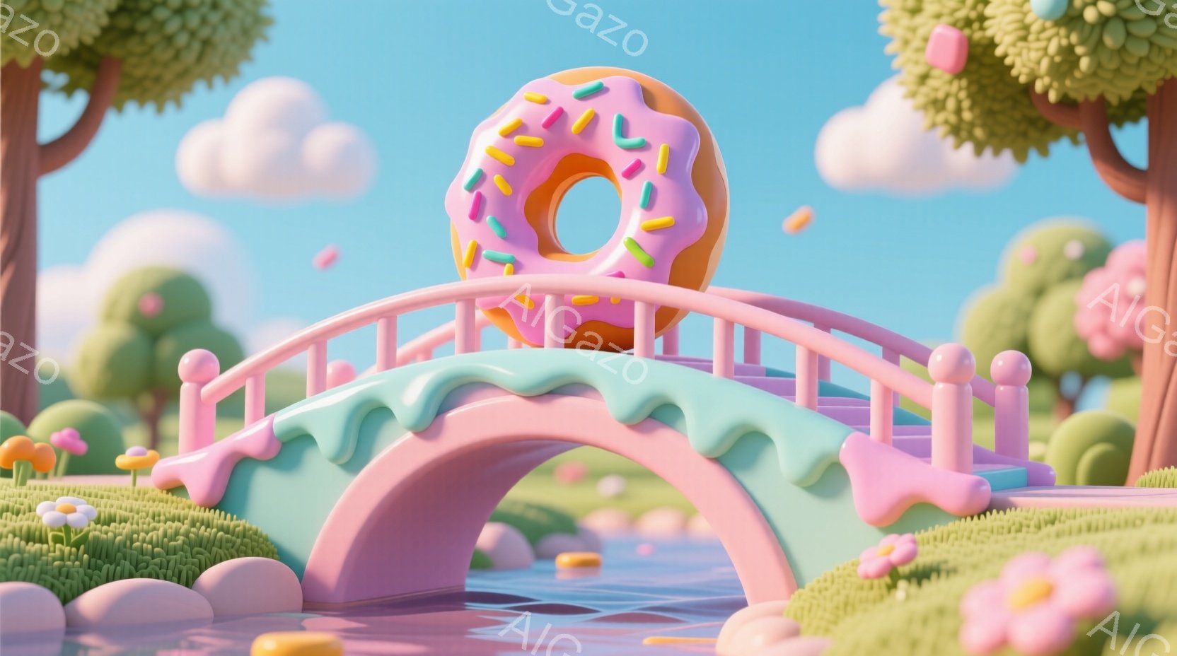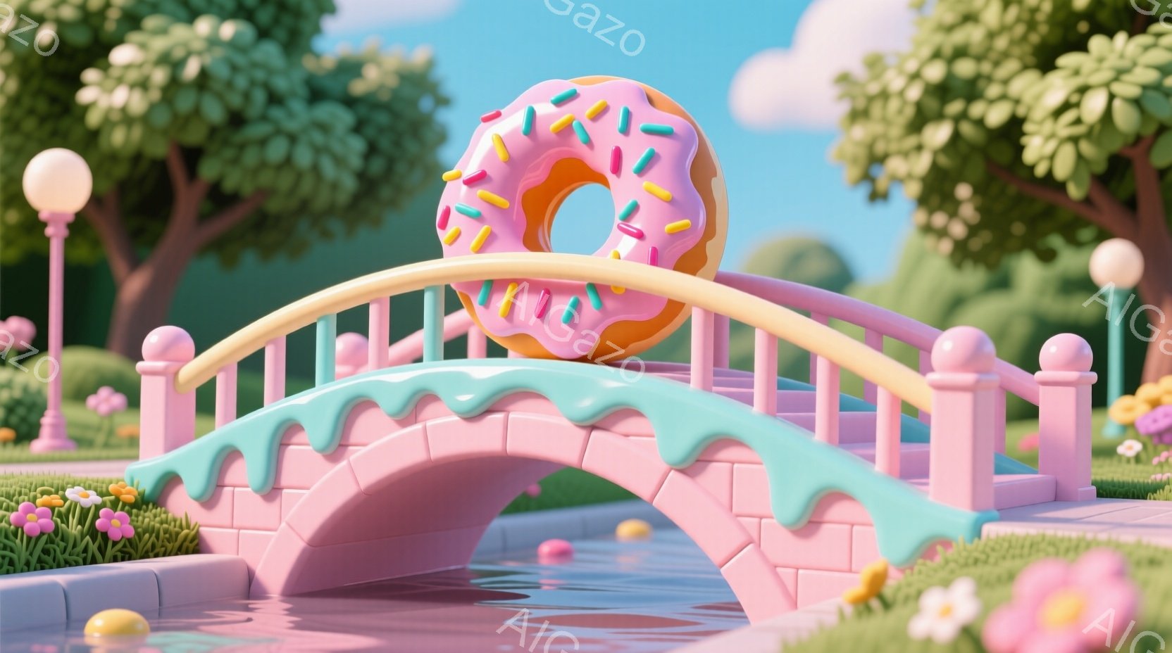 鮮やかなピンク色のアーチ橋が、緑豊かな川の上にかかっています。橋の上には、カラフルなトッピングが施された大きなドーナツが置かれており、周囲には様々な色の花々が咲き乱れています。背景には緑の木々と澄んだ青空が広がり、全体的に夢のような、おとぎ話のような雰囲気です。