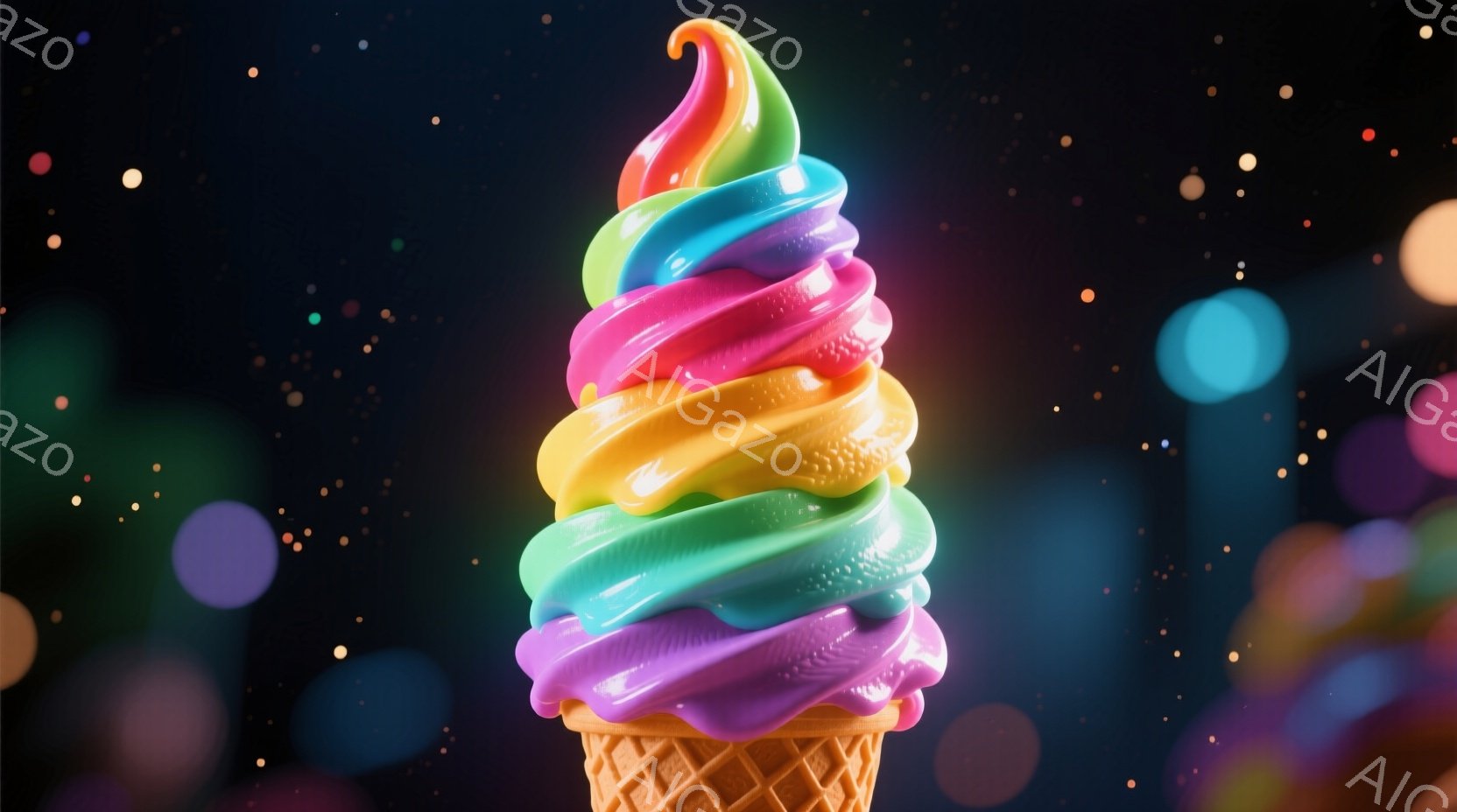 明るいピンク色から始まり、水色、緑、黄色、オレンジ、そして紫へと変化する美しいソフトクリームが、コーンの中で渦巻いている。背景は暗く、ぼやけた光の玉がいくつかあり、ソフトクリームが際立って見える。全体的に鮮やかで、甘くて楽しい雰囲気が漂っている。