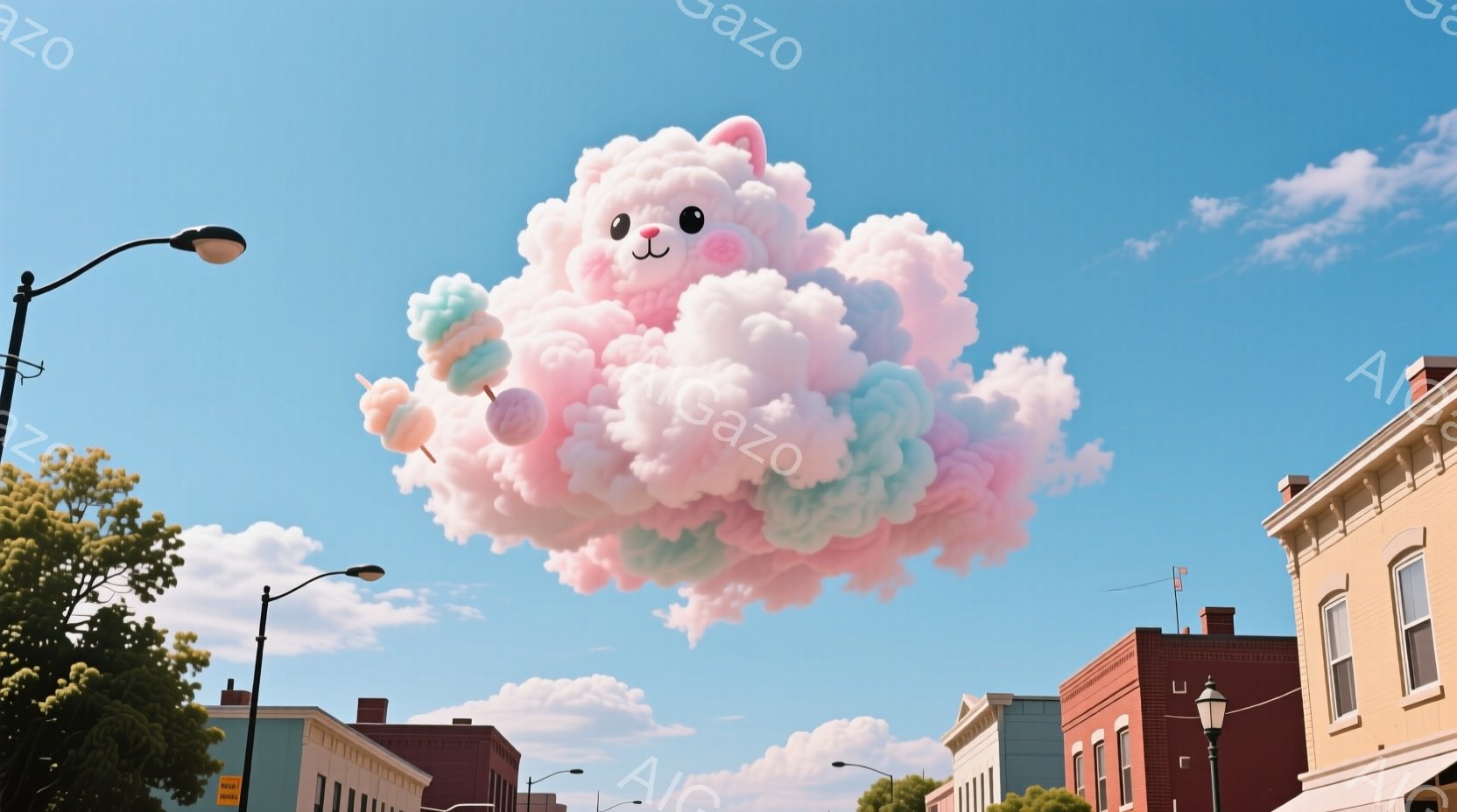 青空の下、街並みの真上に巨大な虹色の雲が広がっている。雲はピンクや紫、緑など様々な色合いが混ざり合い、まるで綿菓子のようにふわふわとした質感をしている。街は古いレンガ造りの建物が多く、穏やかでどこか懐かしい雰囲気を漂わせている。