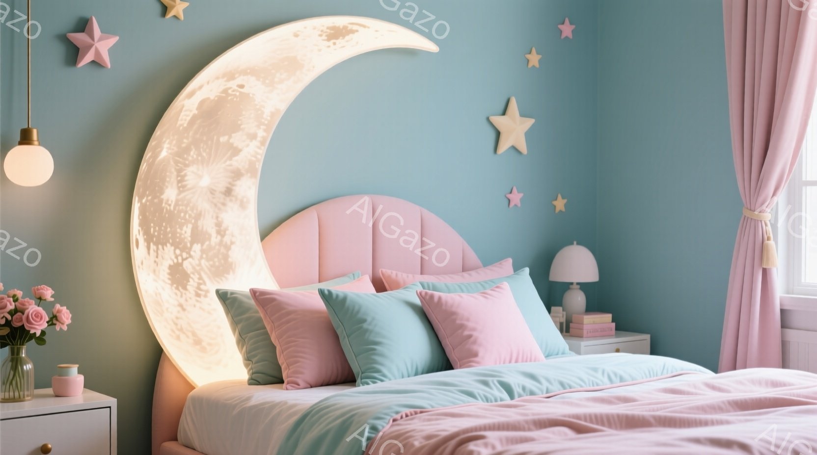 柔らかいピンクと水色の枕が置かれた白いベッドルームで、背景はパステルブルーの壁です。ベッドの頭の上には、明るく光る大きな月の形のライトが飾られており、右側には白いチェストと花瓶が置かれています。全体的に穏やかで夢のような雰囲気が漂う、安らぎの空間です。