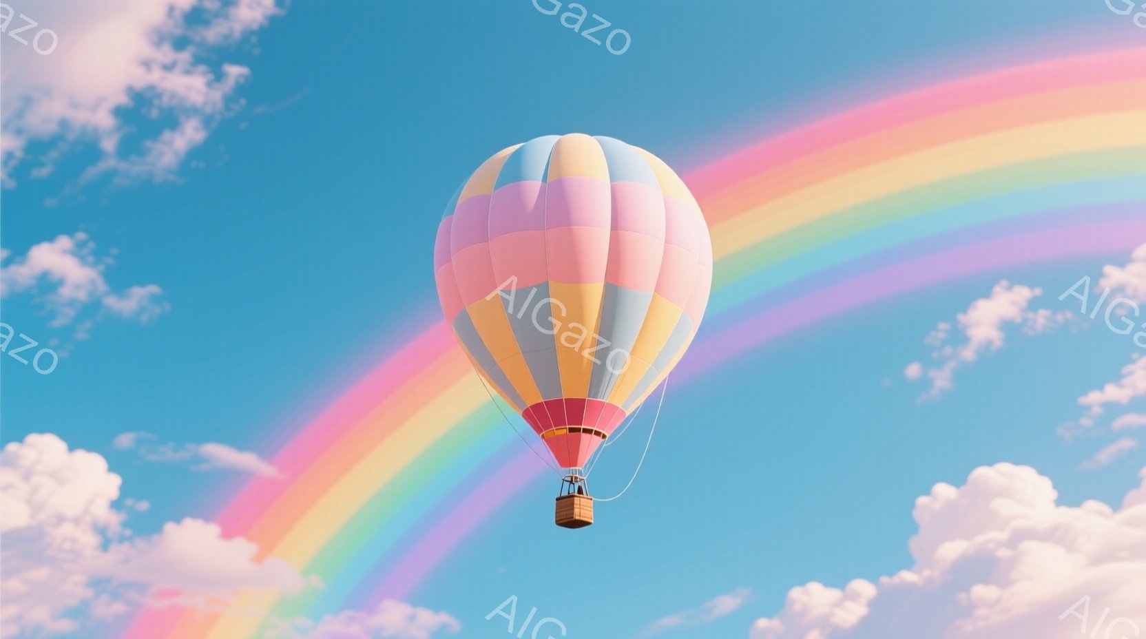 鮮やかな虹が空に架かり、ピンク、黄色、水色などのパステルカラーの熱気球が2つ浮かんでいる。下側の熱気球には、籐で編まれた籠がぶら下がり、穏やかな空模様と合わせて、夢のような、平和な雰囲気を醸し出している。雲はふんわりと柔らかい印象を与え、全体的に明るく希望に満ちた情景である。