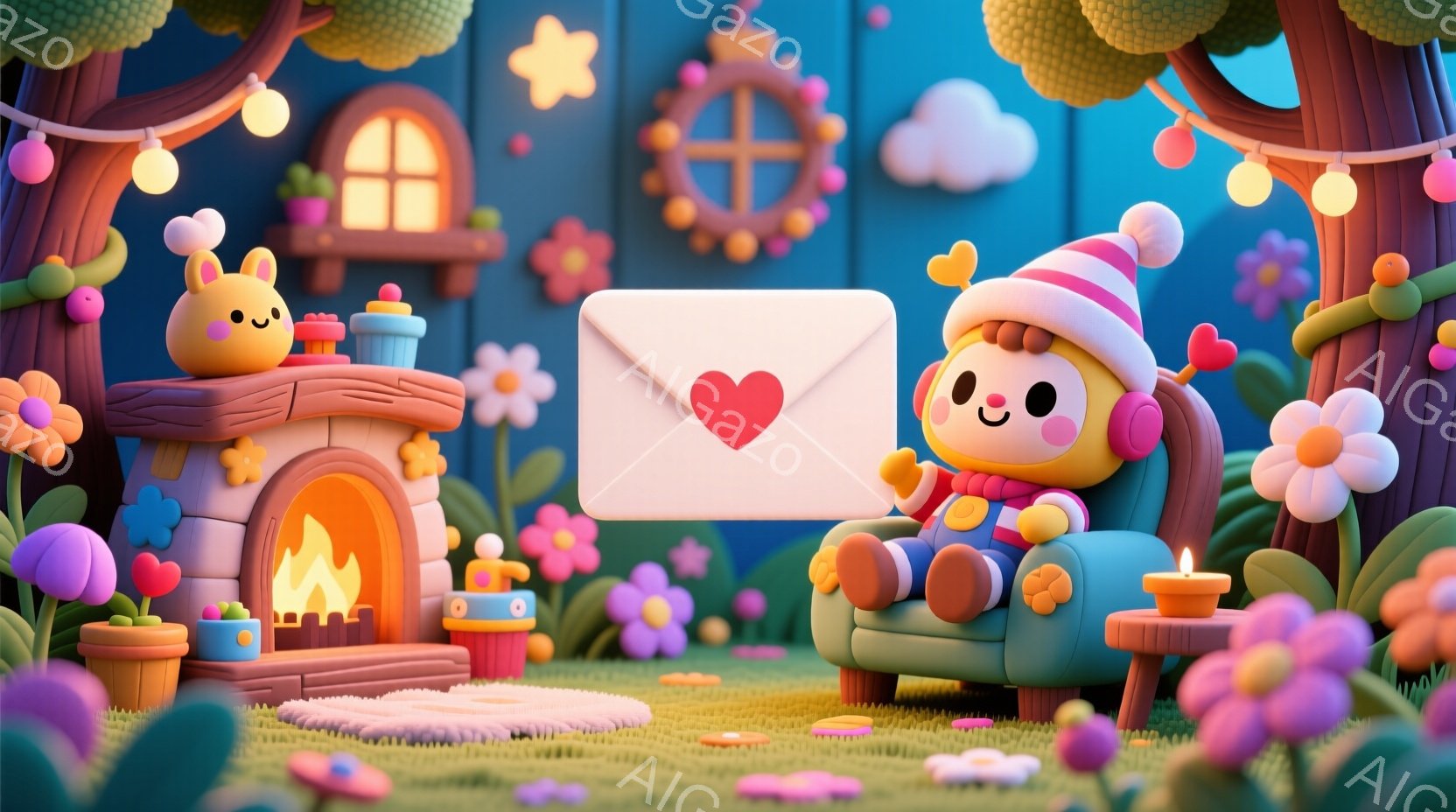 暖炉のない、可愛らしいコテージの室内です。パステルカラーのソファとアームチェアが配置され、温かい雰囲気の照明が灯っています。窓の外には緑豊かな庭と、プレゼントボックスで飾られたキノコ型の家が見え、春らしい穏やかな一日が感じられます。