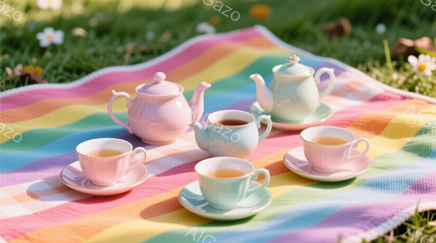 カラフルなチェック柄のピクニックブランケットの上に、パステルカラーのティーポットとティーカップが並べられています。ティーポットとカップはそれぞれ異なる色をしており、春らしい穏やかな雰囲気を醸し出しています。背景には緑の草地が広がり、暖かく晴れた日のピクニックを楽しんでいるような印象を与えます。