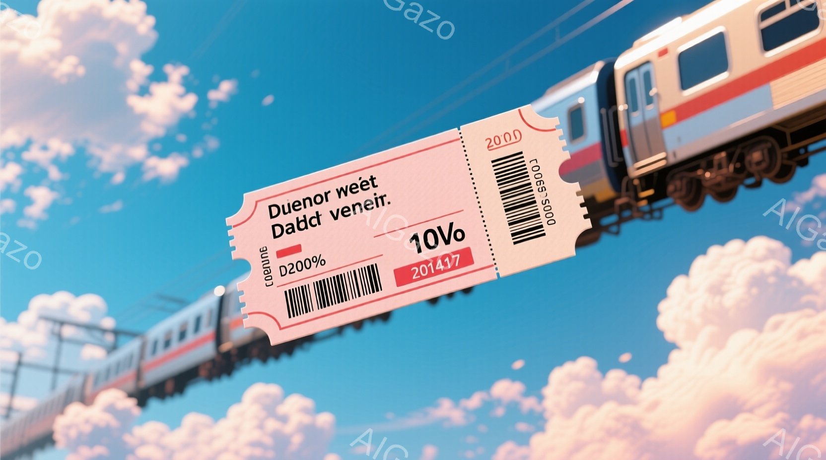 この無料AI生成画像「空にはふわふわとした白い雲が広がり、明るい青空が広がっています。鮮やかなピンク色の切符が中央に大きく配置され、「RINKET」と書かれており、バーコードと小さな星の装飾があります。背景には未来的なデザインの白い列車が雲の中に浮かんでおり、全体的に夢のような、希望に満ちた雰囲気を醸し出しています。」は、2025年10月23日に作成されました。 サイズは 1664×928px の高解像度で、商用利用も可能なフリー素材として提供しています。