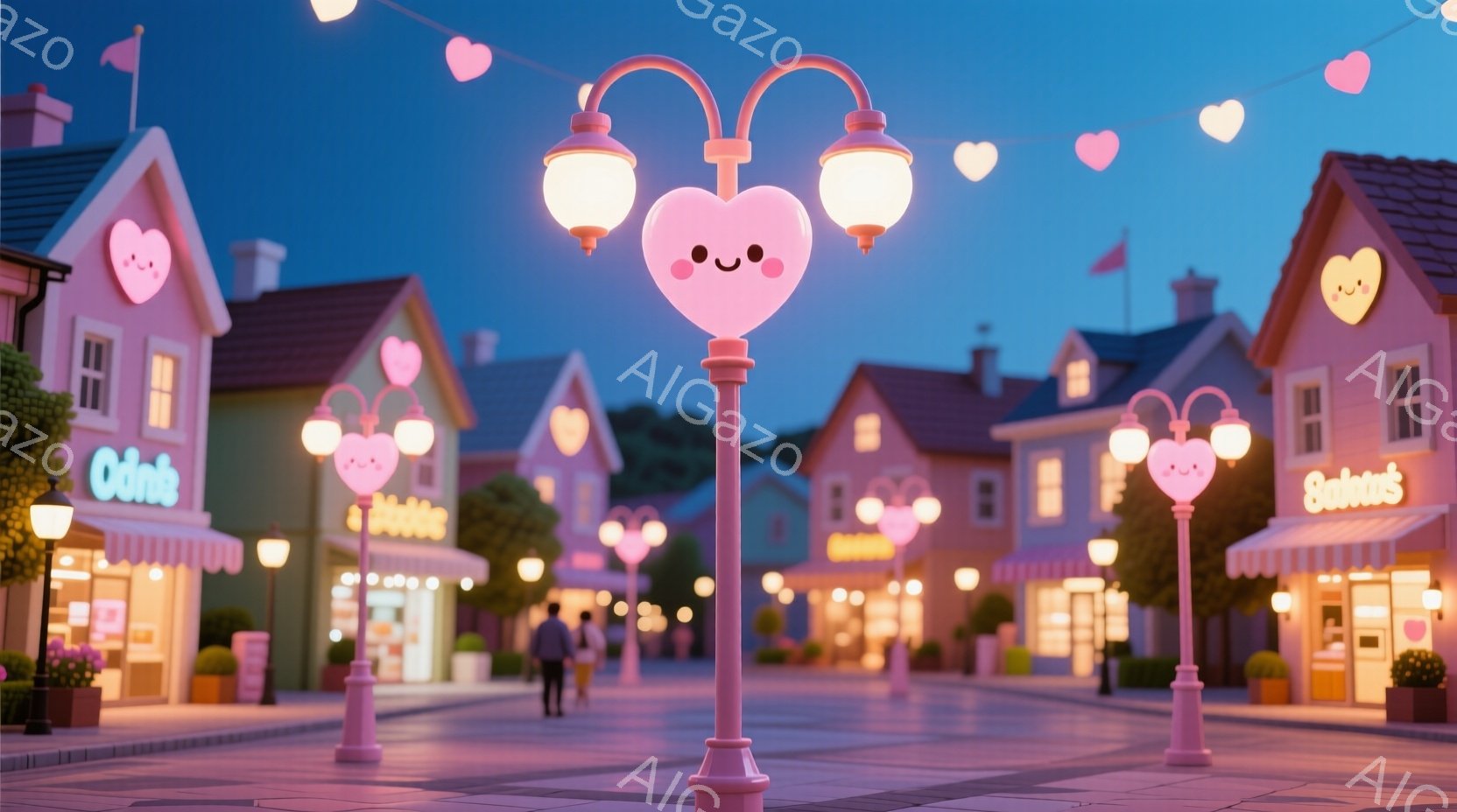 優しいピンクと紫の色調で、可愛らしい街並みが描かれています。電柱には笑顔のハート型のライトが灯り、道にはハート型の光が舞い、暖かく夢のような雰囲気を醸し出しています。建物はパステルカラーで、可愛らしいデザインで統一されており、まるで絵本の中のような世界観です。