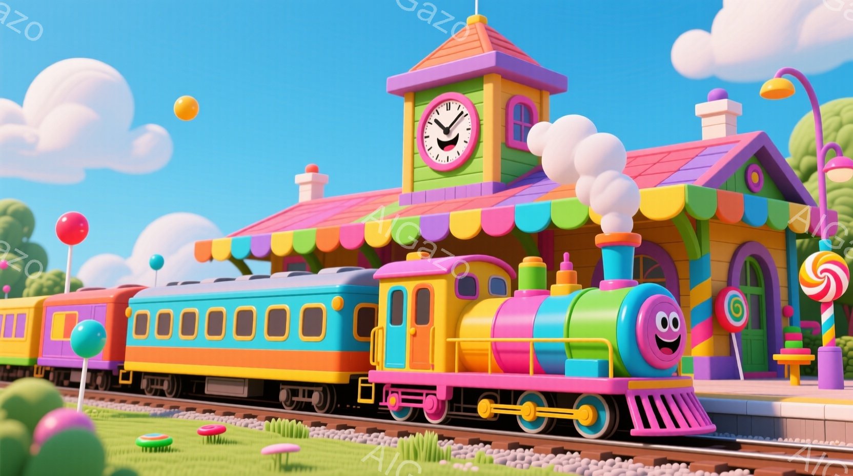 カラフルな蒸気機関車が駅に停車しており、ピンク、青、緑、黄色など鮮やかな色で構成されています。駅舎は同様にカラフルで、時計台が特徴的です。背景には青い空と白い雲が広がり、全体的に明るく陽気な雰囲気で、まるで子供向けの絵本の世界のようです。