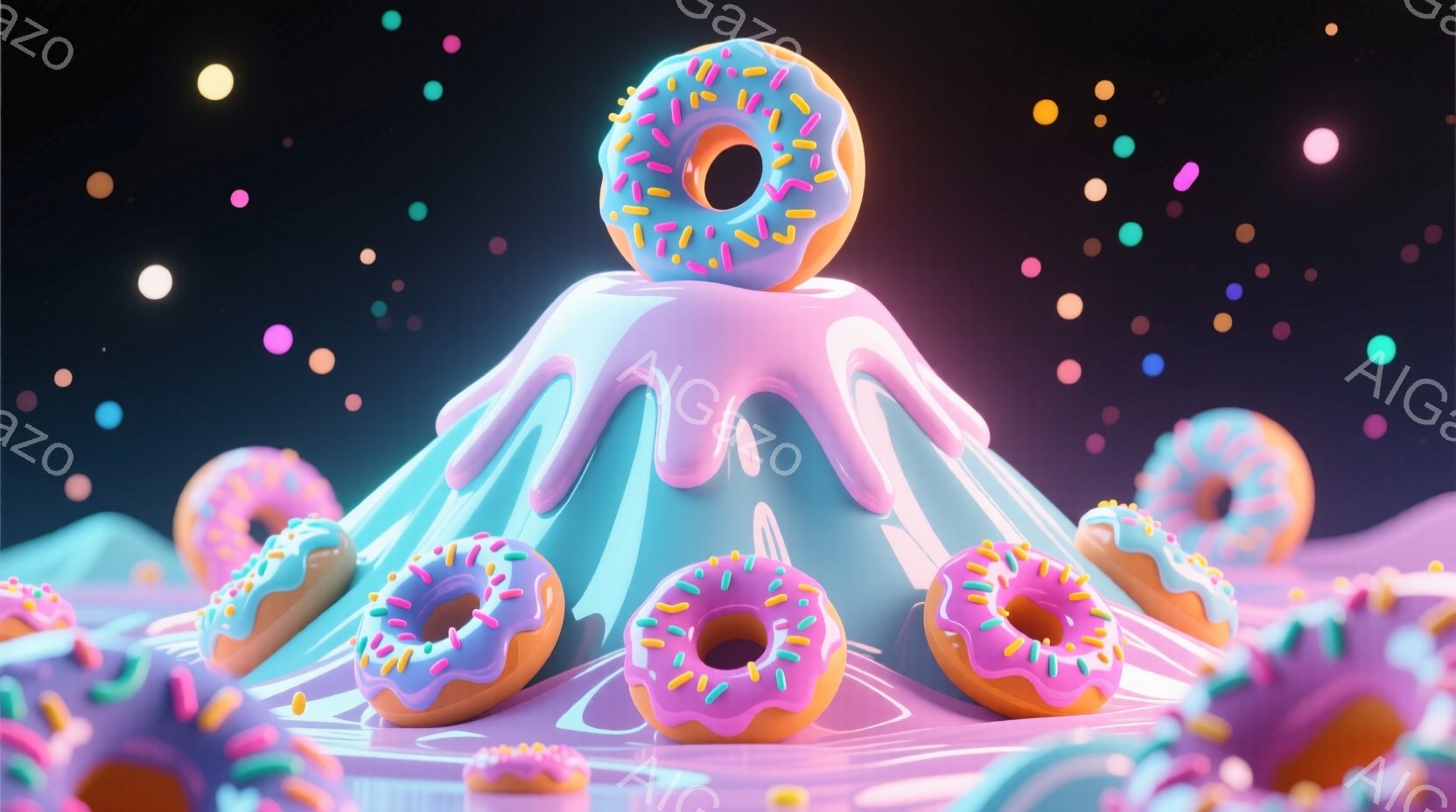 鮮やかなターコイズブルーとピンクのクリームで覆われた山々が、夜空を背景に幻想的に浮かび上がっています。ドーナツが山頂や斜面に配置され、カラフルなスプリンクルがアクセントとなっています。全体的に明るくポップな雰囲気で、まるで夢の中の風景のようです。