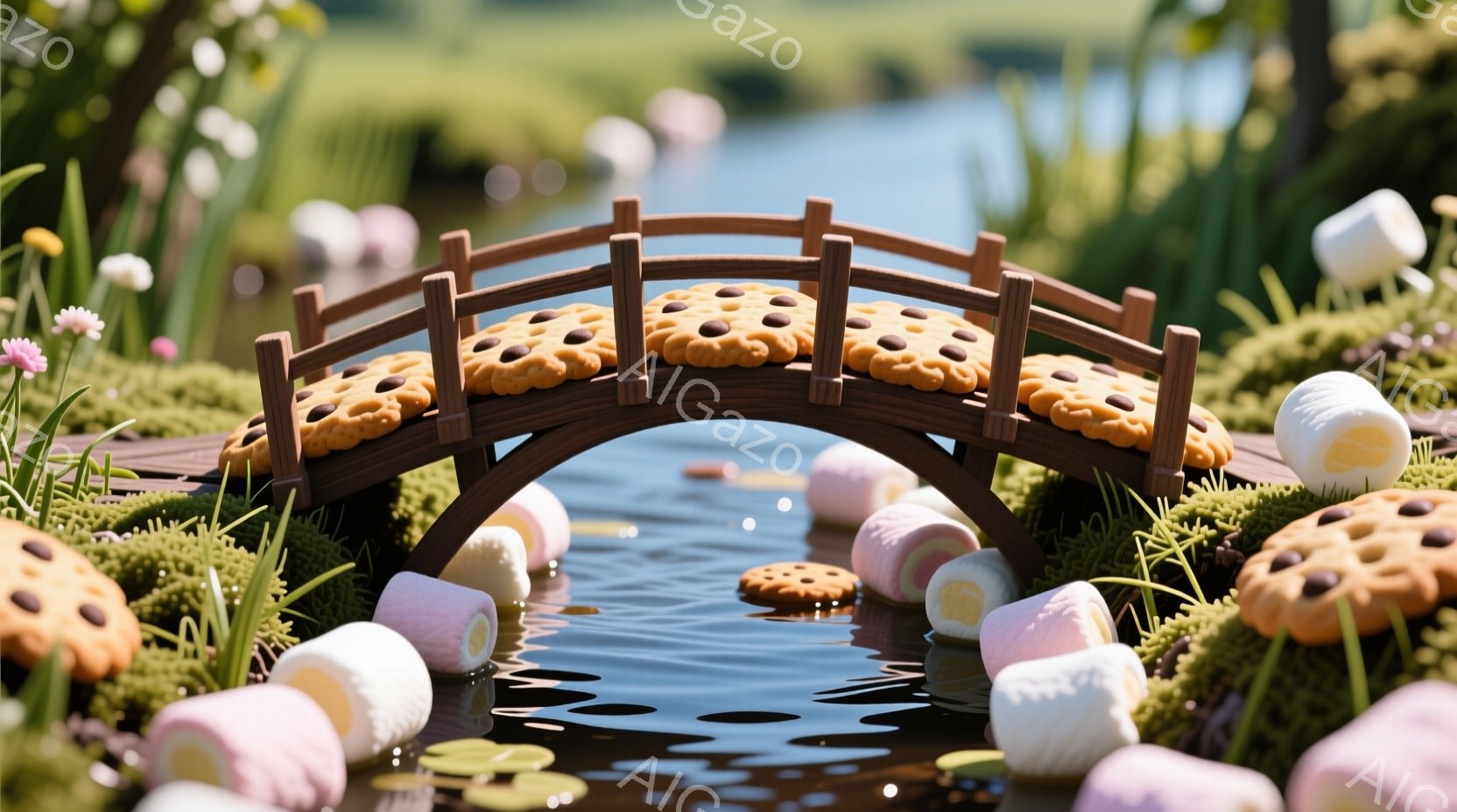 チョコレートチップクッキーが二つ、茶色い川の上を橋のように渡っている様子が写っている。川岸にはマシュマロや小さな花が点在し、背景は緑豊かな草地で、全体的に夢のような、お菓子がテーマのファンタジーな雰囲気が漂っている。水面には光が反射し、幻想的な光景を演出している。