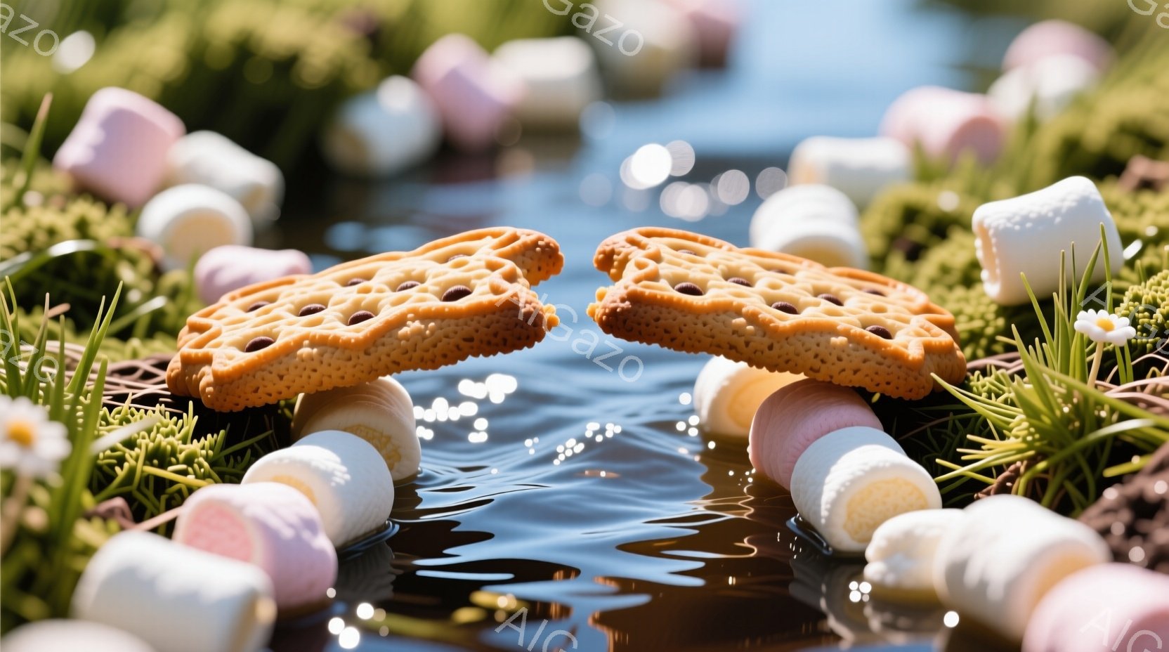 緑豊かな風景の中に、お菓子の橋が架かっています。マシュマロやクッキーが橋の周りや水面に浮かび、可愛らしい花々が彩りを添えています。全体的に夢のような、お菓子でできた世界を表現した、甘くて優しい雰囲気です。
