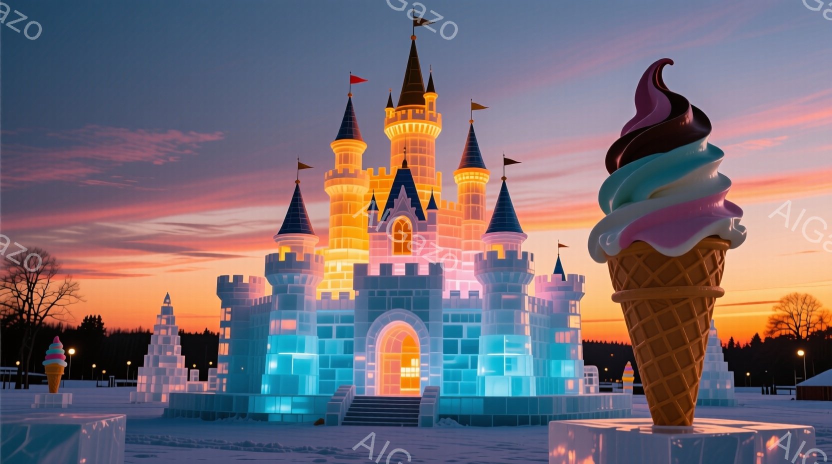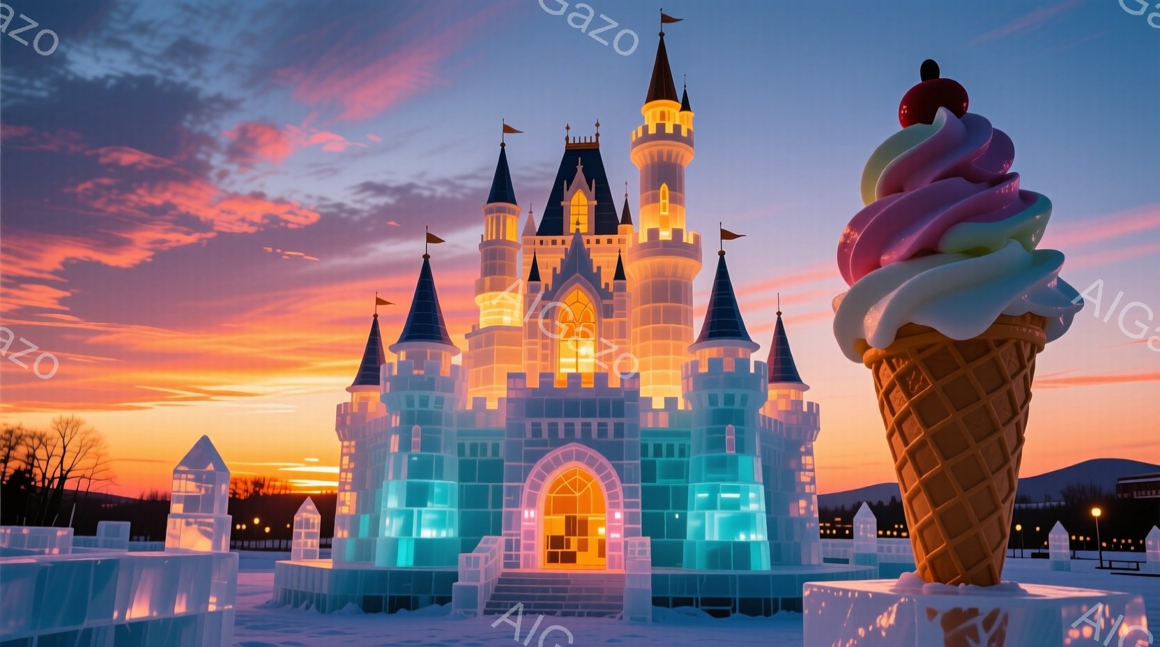 鮮やかな色彩で照らされた巨大な氷の城が、雪原にそびえ立っている。夕焼け空が背景に広がり、城とアイスクリームの彫刻に暖かな光を投げかけている。遠くには木々が見え、全体的に幻想的で冬の暖かさを感じさせる雰囲気である。