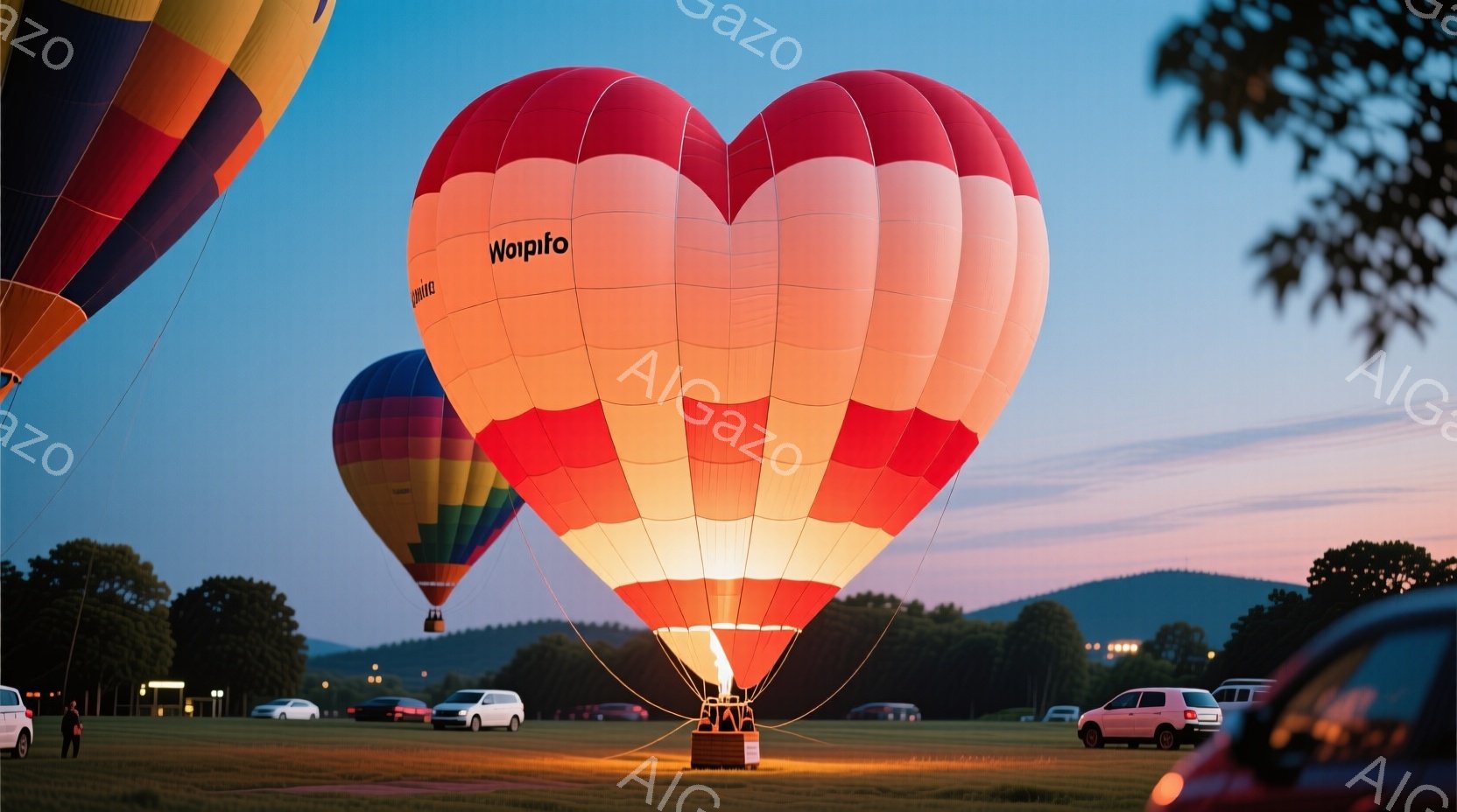 空には、ハート型の大きな熱気球が浮かんでおり、赤とオレンジ色のグラデーションが美しく輝いている。熱気球の下には、バスや車が見え、周囲は緑豊かな木々に囲まれた広い草原が広がっている。夕暮れ時の穏やかな光が、全体に暖かくロマンチックな雰囲気を醸し出している。
