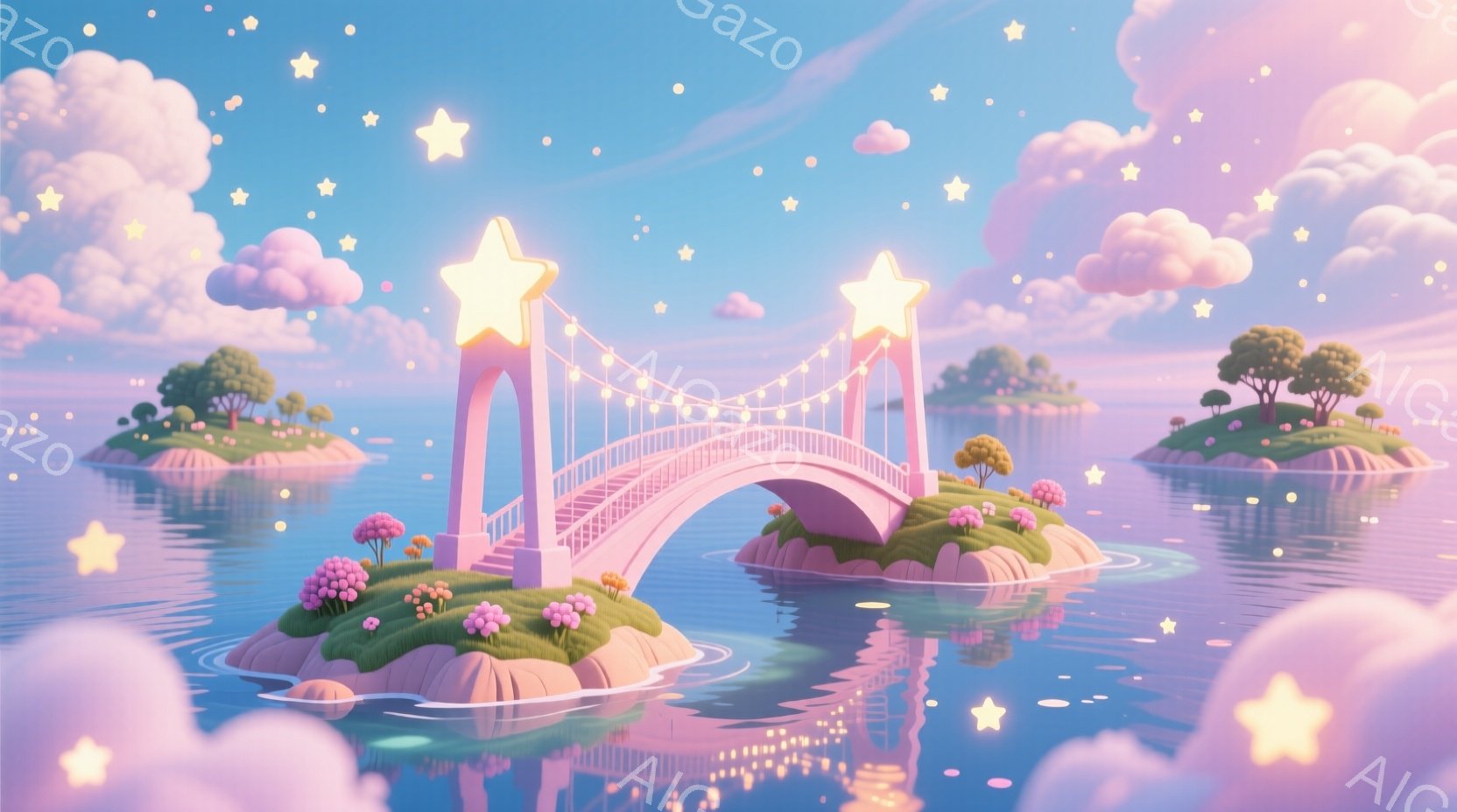 幻想的な風景が広がっており、ピンク色のアーチ状の橋が二つの小さな島を結んでいます。橋の周囲には星が散りばめられ、夜空と海面が穏やかに輝き、まるで夢の中のような雰囲気を醸し出しています。島々には可愛らしい木々や花々が生い茂り、全体的に柔らかく優しい印象を与えます。