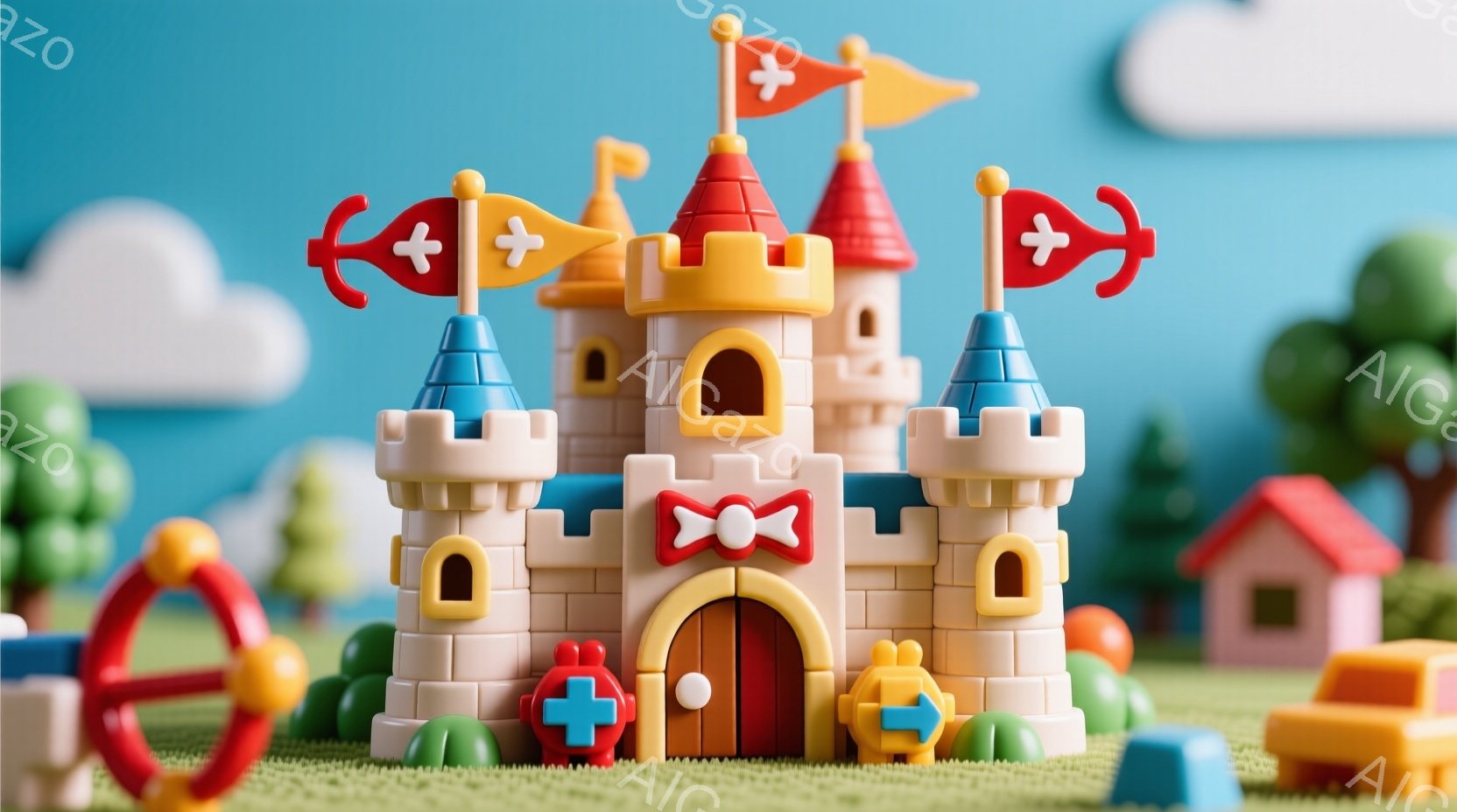明るい緑色の芝生の上に、クリーム色のブロックで作られたお城が建っています。青い屋根には、赤、黄、緑の旗が飾られており、可愛らしい雰囲気を醸し出しています。背景には、小さな家や木々が見え、晴れた空の下で遊んでいるような温かい印象を与えます。