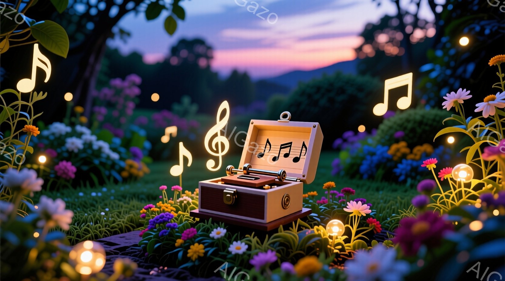 古い木製のオルゴールが、色とりどりの花々に囲まれた草の上に置かれている。背景には、夕焼け空と緑豊かな木々が見え、周囲には光り輝く小さな提灯が点在している。全体的に、夢幻的で牧歌的な、音楽と自然が調和した穏やかな雰囲気を醸し出している。