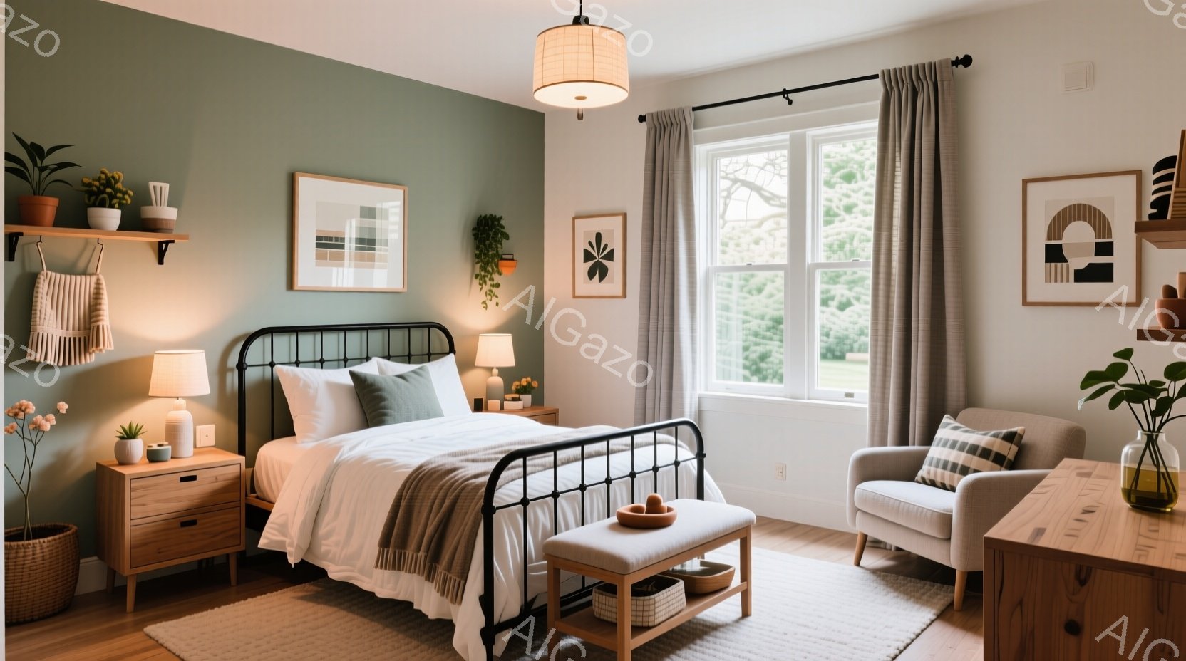 落ち着いた緑色の壁が印象的な寝室で、アンティーク調の黒いベッドが中心に配置されています。ベッドにはオフホワイトの寝具と、アースカラーのクッションやブランケットがコーディネートされ、自然な雰囲気を作り出しています。部屋全体には植物が飾られ、窓からは明るい屋外の景色が見え、リラックスできる穏やかな空間が演出されています。