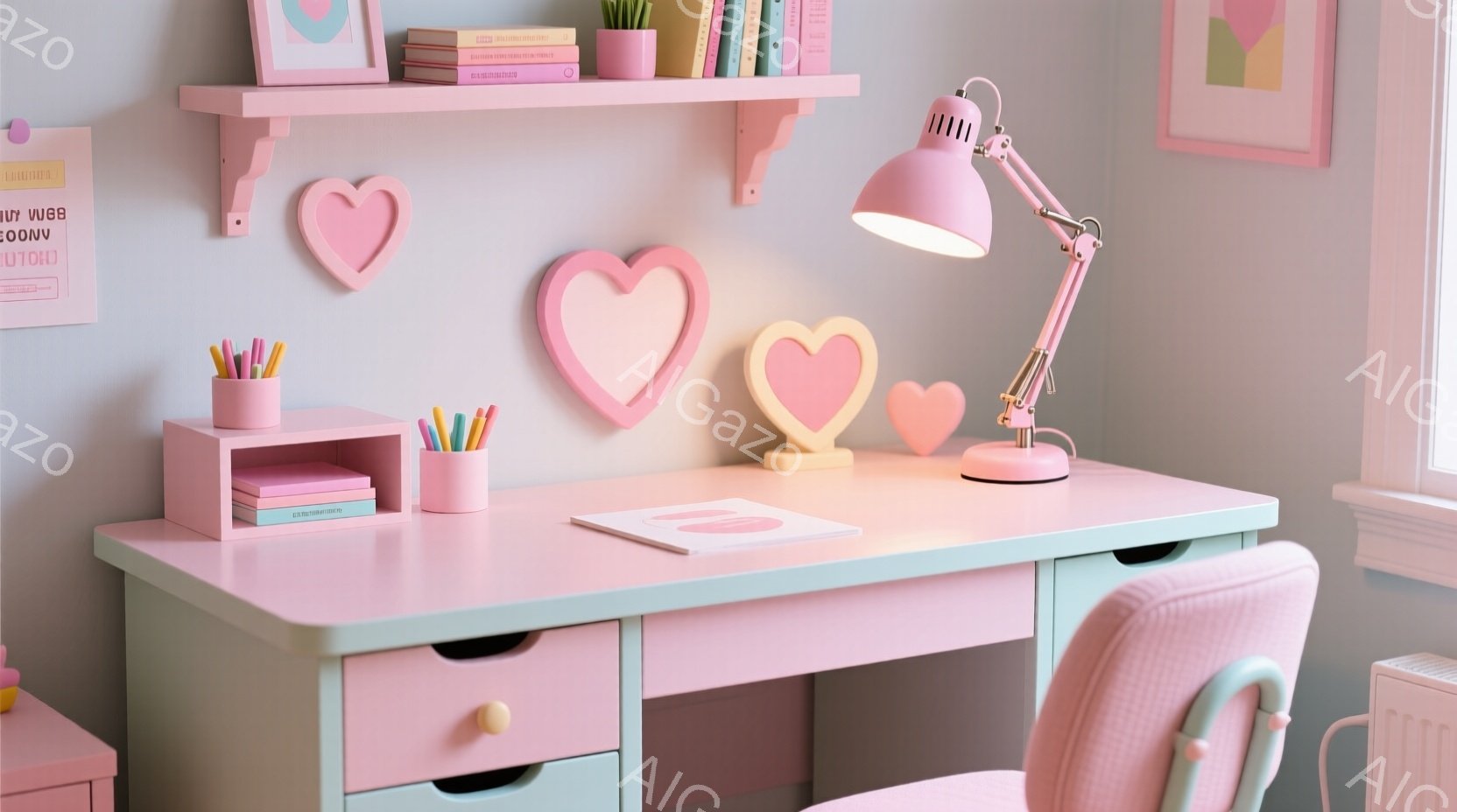 淡いピンク色の机の上には、本が積み重ねられたブックスタンドと、ノート、ペン、そしてタブレットが置かれています。壁は水色で、ピンク色のハート型の飾りと絵が飾られており、明るい雰囲気です。全体的に可愛らしく、勉強や作業に集中できるような、穏やかで優しい空間が表現されています。