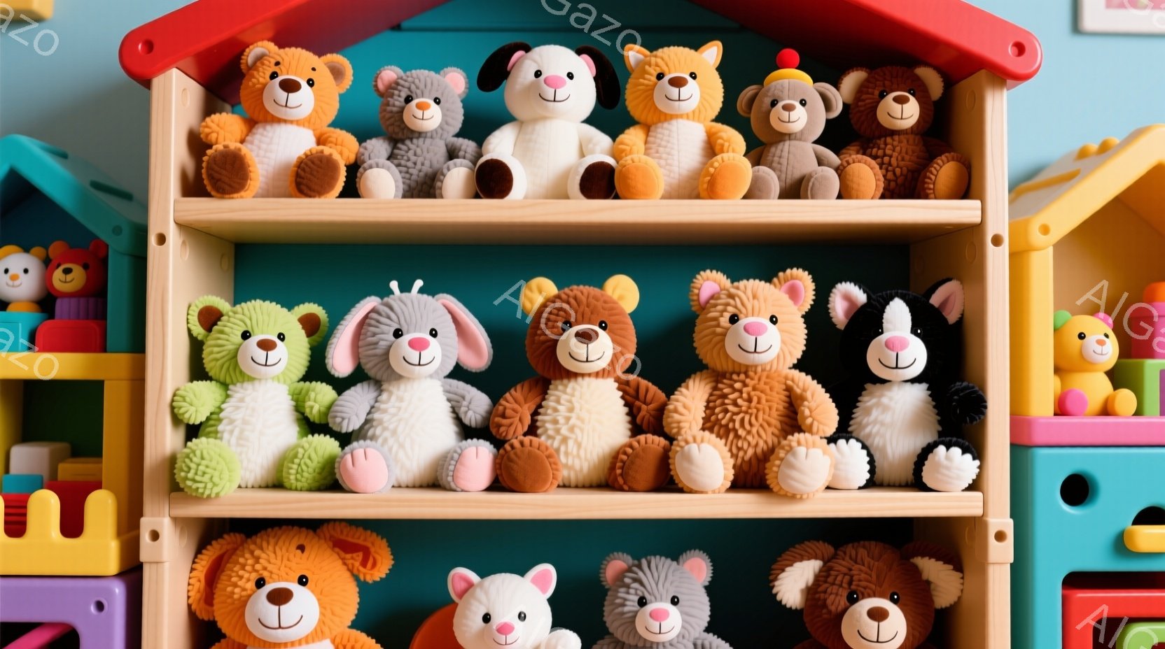 複数のテディベアや動物のぬいぐるみたちが、緑色の棚に整然と並べられています。それぞれのぬいぐるみは愛らしい表情をしており、カラフルで可愛らしい雰囲気です。背景にはブロックや建物の模型が見え、子供部屋のような温かさと遊び心を感じさせます。