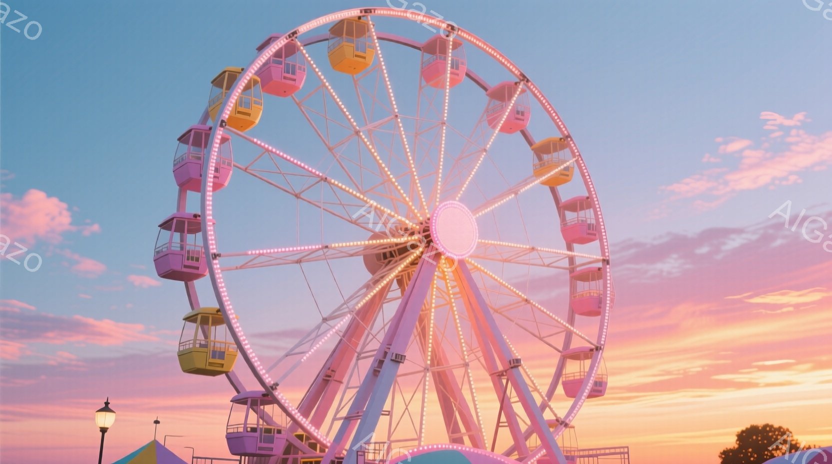 カラフルな観覧車が夕焼け空の下にそびえ立っており、パステルピンク、水色、黄色などの明るい色で彩られています。背景にはヤシの木が見え、遊園地の一部と思われるテントや装飾が配置されており、暖かい夏の日の遊園地の雰囲気を醸し出しています。空はオレンジ色とピンク色のグラデーションで、穏やかで楽しい雰囲気を作り出しています。