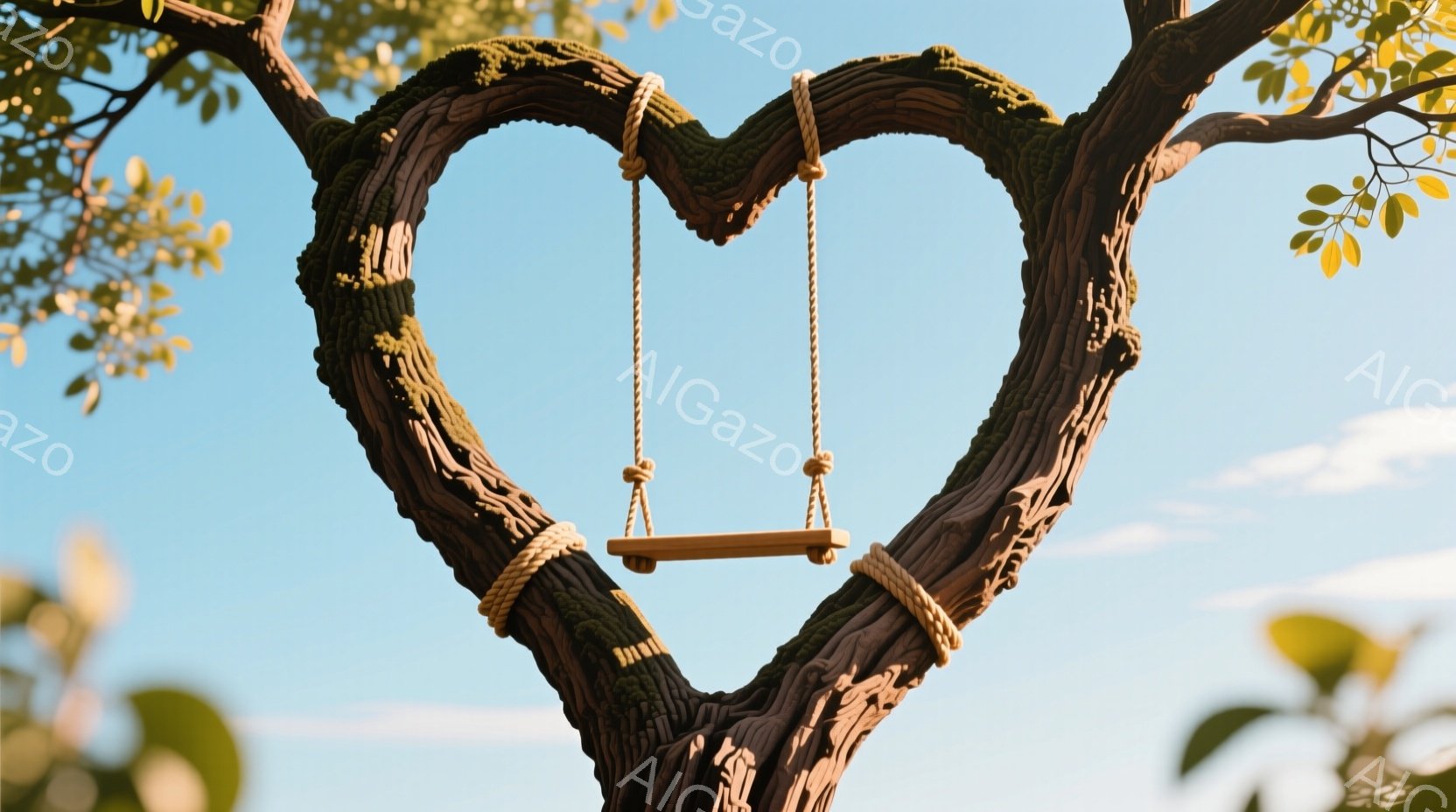 巨大な古木の枝がハート形に湾曲しており、そこからロープと板で作られた簡素なブランコが吊り下げられています。背景には緑豊かな草原とぼんやりとした建物が見え、空は柔らかい光に満ちています。 全体的に穏やかで牧歌的な雰囲気が漂い、自然の美しさと静けさを感じさせます。