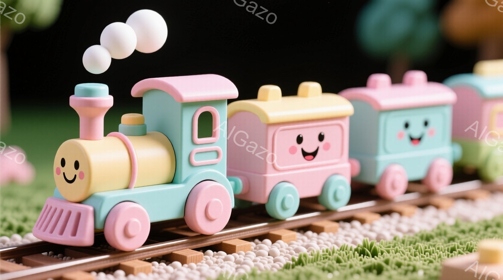 明るいピンク、水色、黄色で構成された、愛らしい表情の機関車と貨車が線路の上を走っている様子が描かれています。背景には緑の芝生、カラフルな花、そしてふわふわとした雲が広がり、晴れた日の牧歌的な風景を作り出しています。全体的に、温かく、おとぎ話のような雰囲気で、子供向けのイラストレーションにぴったりです。