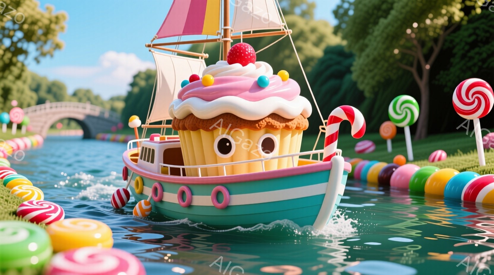 鮮やかな青空の下、キャンディやグミで飾られた小川を、カップケーキを模した可愛らしいボートが航行しています。ボートのクリームにはカラフルなスプリンクルが散りばめられ、赤いチェリーが飾られています。背景には緑豊かな草地と、遠くに他のボートが見え、夢のような甘い世界が広がっています。