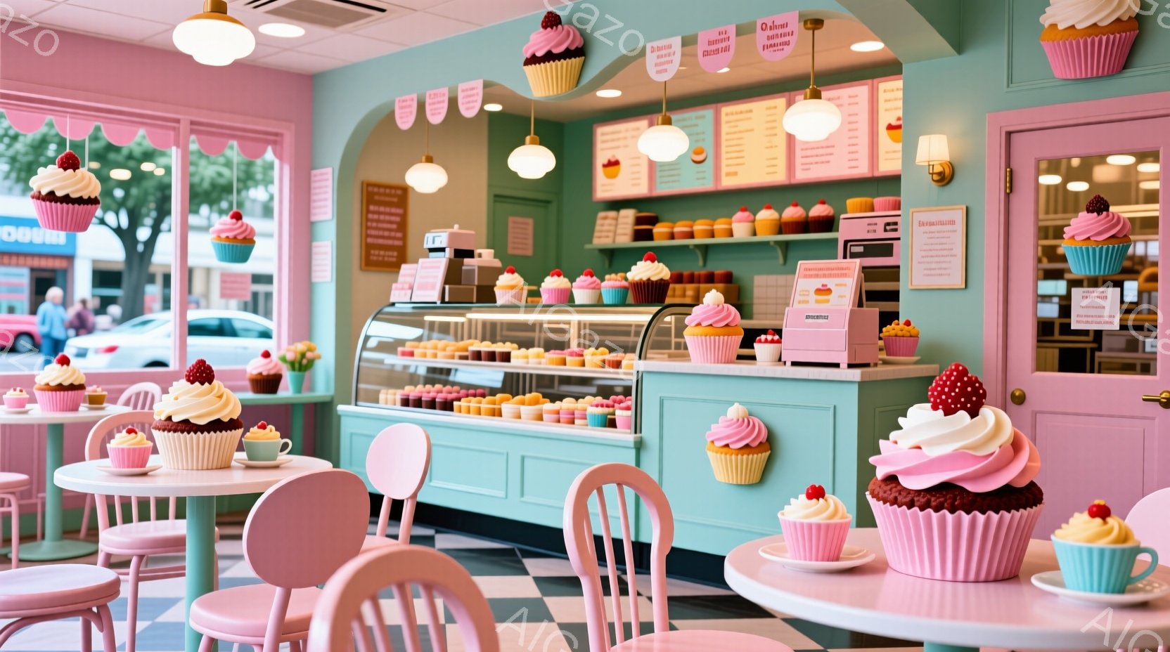 明るいピンクとターコイズブルーを基調としたカップケーキ店です。ショーケースとテーブルには、カラフルで可愛らしいカップケーキが並べられており、窓からは自然光が差し込んでいます。全体的に甘くて夢のような、優しい雰囲気が漂っています。