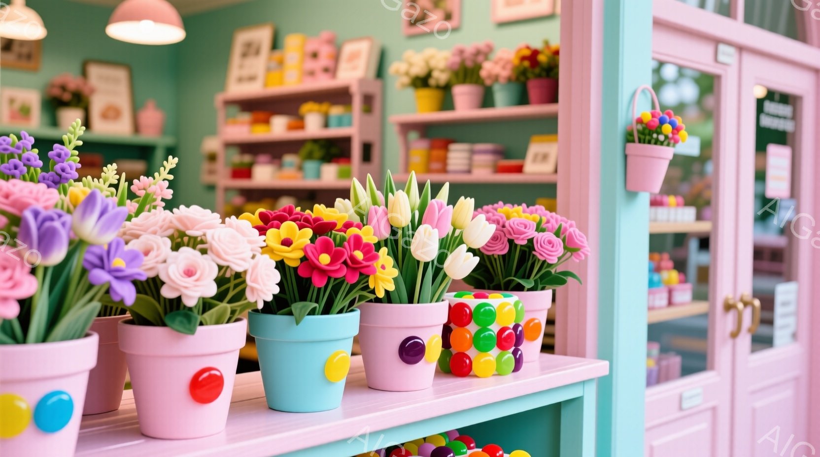カラフルな鉢植えの花が棚に整然と並べられています。背景には、同じようにカラフルな鉢植えで埋められた別の棚と、丸いボールが敷き詰められた床が見えます。全体的に明るく、遊び心のある、お菓子のような雰囲気です。