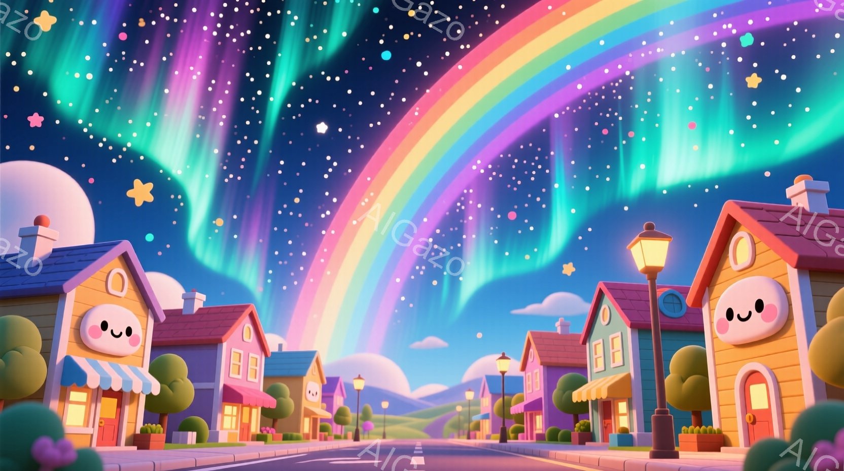 カラフルな家々が並ぶ可愛らしい街並みが描かれています。夜空には鮮やかな虹とオーロラが広がり、星が瞬いています。家々はそれぞれユニークな表情を持っており、温かくファンタジーな雰囲気を醸し出しています。