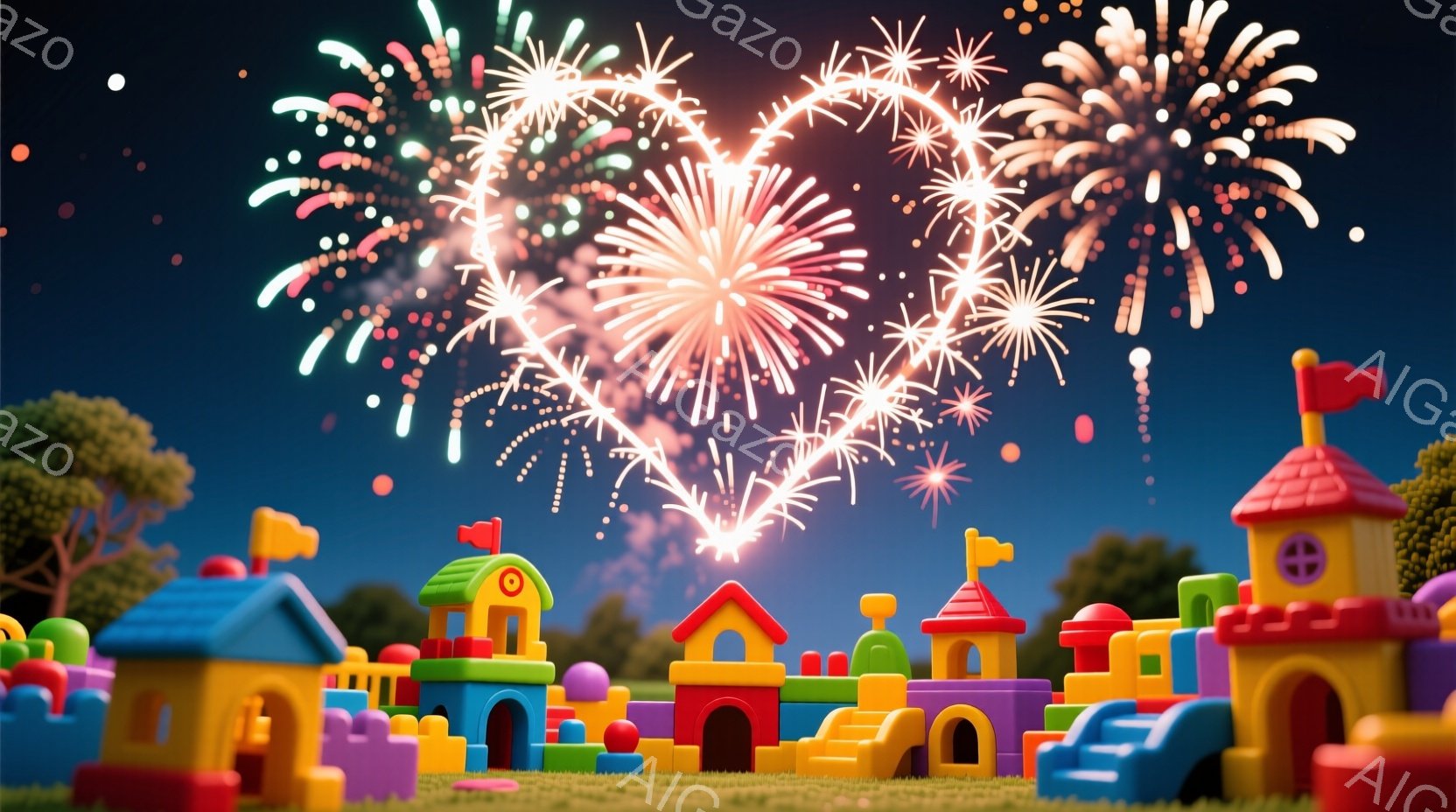 カラフルな玩具のような家々が並び、緑の芝生の上に配置されています。夜空には、ハート形に輝く美しい花火が咲き乱れ、温かくロマンチックな雰囲気を醸し出しています。背景は暗い青色で、花火の光がより一層引き立ち、まるで夢のような世界観を作り出しています。