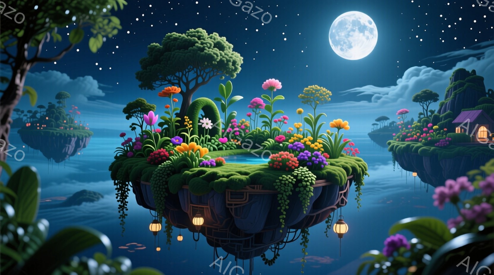 鮮やかな緑の浮島が紺碧の空に浮かび、月明かりに照らされています。島々には様々な花が咲き乱れ、手入れされた庭園と小さな家屋が点在しており、まるで夢のような幻想的な光景です。穏やかな雲と星空が、静かで平和な雰囲気を醸し出しています。