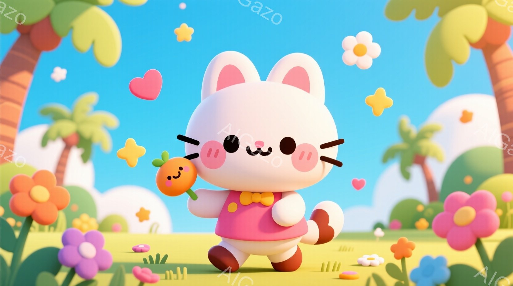 この無料AI生成画像「白いウサギのキャラクターが中央に立ち、赤いリボンをつけています。オレンジ色のクマと水色のウサギのキャラクターが両側にいて、皆笑顔で可愛らしい表情をしています。背景にはパステルカラーの植物、花、そして明るい青空が広がり、全体的に暖かく、楽しげな雰囲気が漂っています。」は、2025年10月23日に作成されました。 サイズは 1664×928px の高解像度で、商用利用も可能なフリー素材として提供しています。