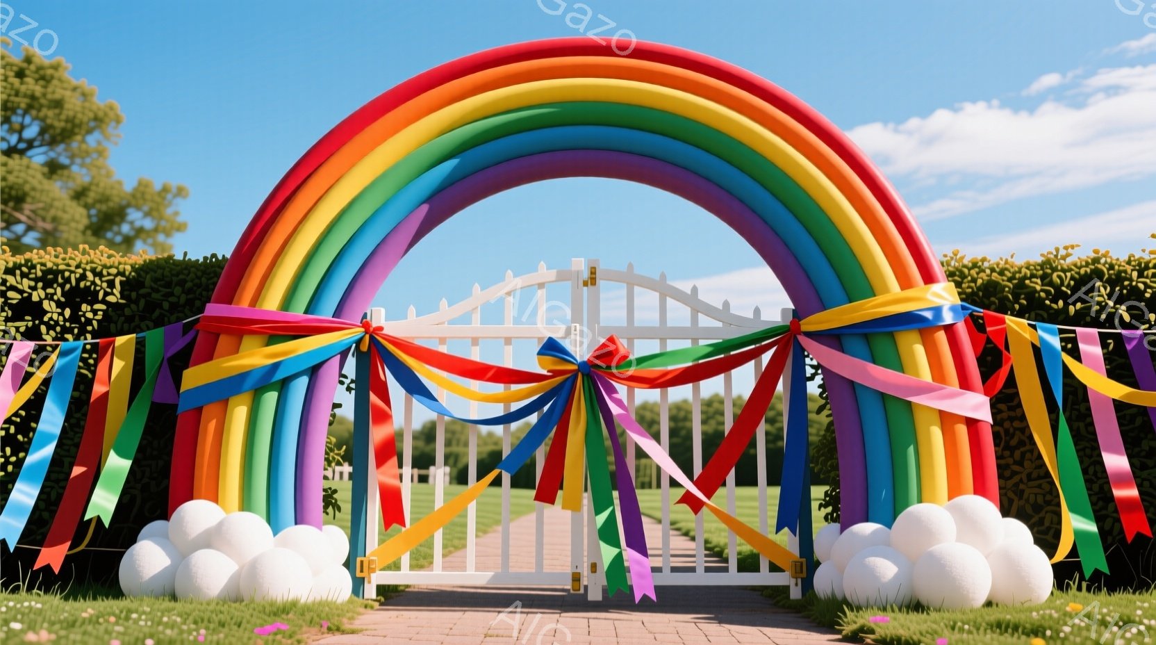 白いゲートの上に、虹色のアーチが飾られています。虹の各色は鮮やかで、ゲートにカラフルなリボンが結び付けられています。背景には緑豊かな芝生と木々が見え、晴れた空が広がっており、明るくお祝いの雰囲気です。