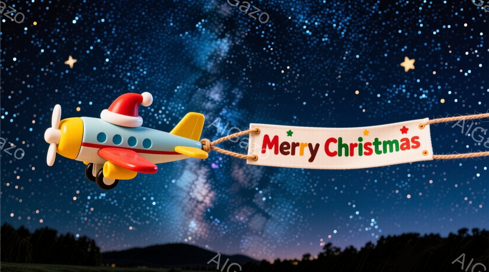 夜空を背景に、赤い小型飛行機が「Merry Christmas」と書かれたバナーを引いて飛んでいます。バナーには緑色のクリスマスツリーと金色の星が飾られています。星が散りばめられた夜空と、下のシルエットのような山の風景が幻想的な雰囲気を醸し出しています。