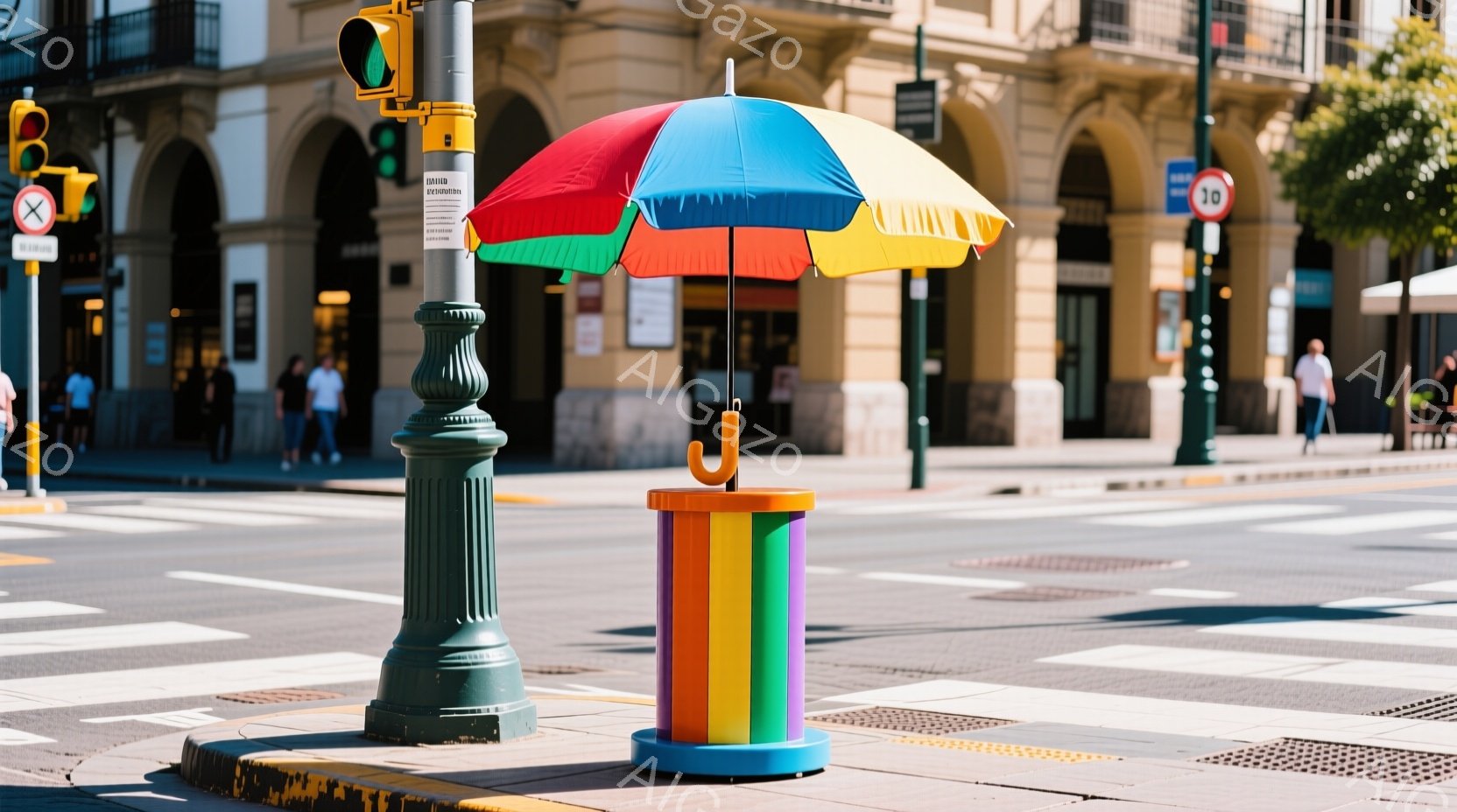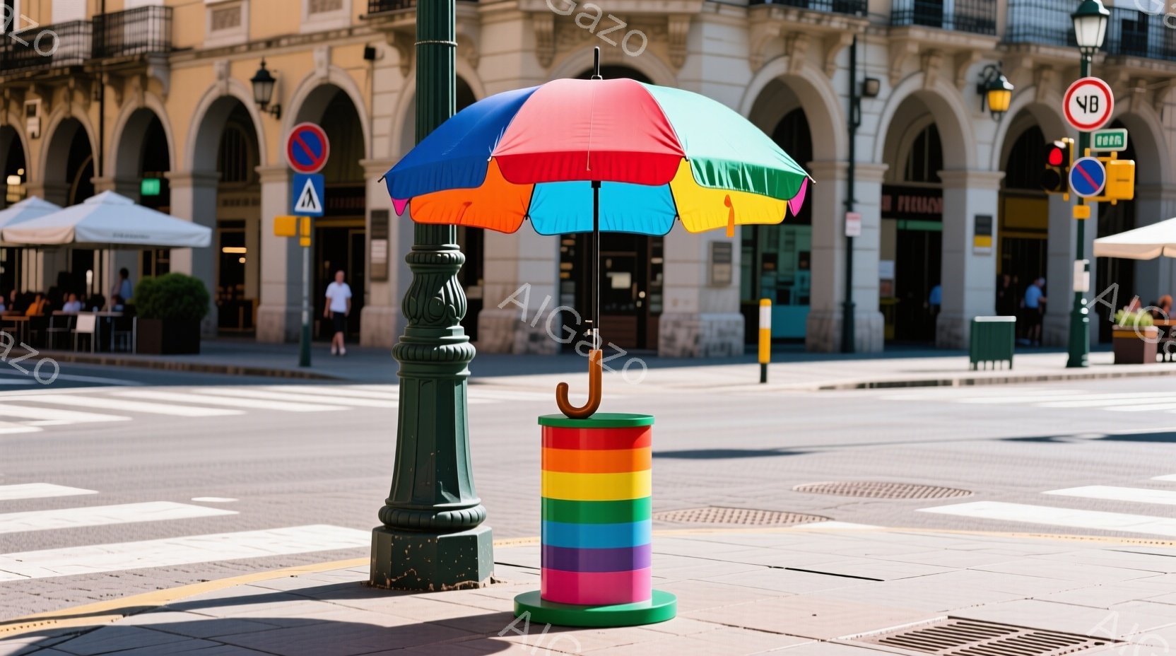 日当たりの良い道路の真ん中に、虹色の傘と傘立てが設置されている。背景には、歴史的な建物が立ち並び、一部の人々が歩道や道路を歩いているのが見える。全体的に晴れた日であり、鮮やかな色彩と建築物が調和した、明るく穏やかな雰囲気が漂っている。