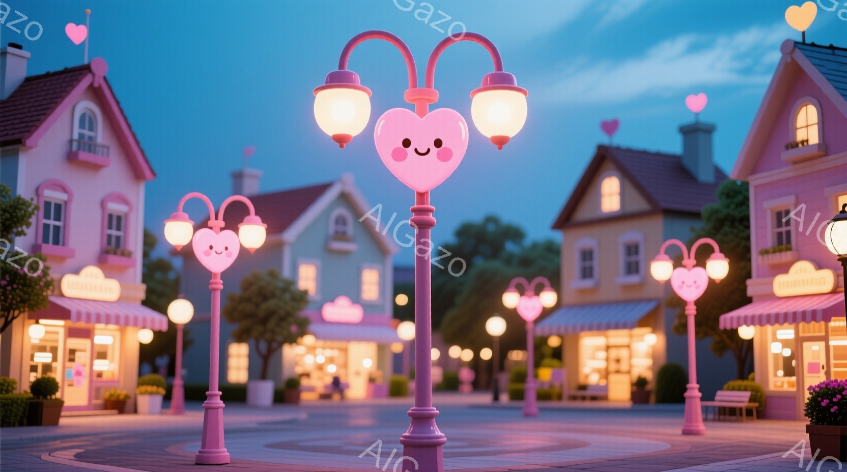 夜の街並みが描かれており、可愛らしい建物が並んでいます。街灯は笑顔を浮かべた顔を持っており、ピンク色のハートが空中に浮かび、ロマンチックで温かい雰囲気を醸し出しています。建物はカラフルで、窓からは柔らかな光が漏れ、静かで平和な夜の様子が伝わってきます。