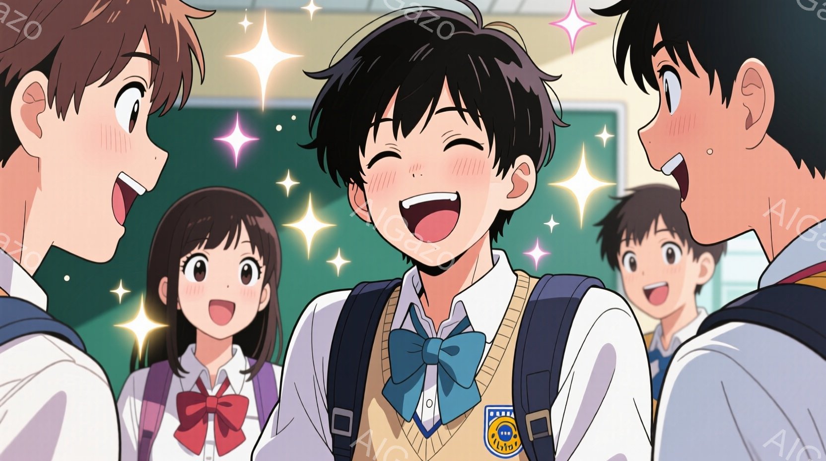 制服を着た数人の高校生を描いています。中央の少年は大きく笑い、頬を赤らめており、他の生徒たちも楽しそうな表情をしています。背景には教室の一部が見え、明るく活気のある雰囲気が感じられます。