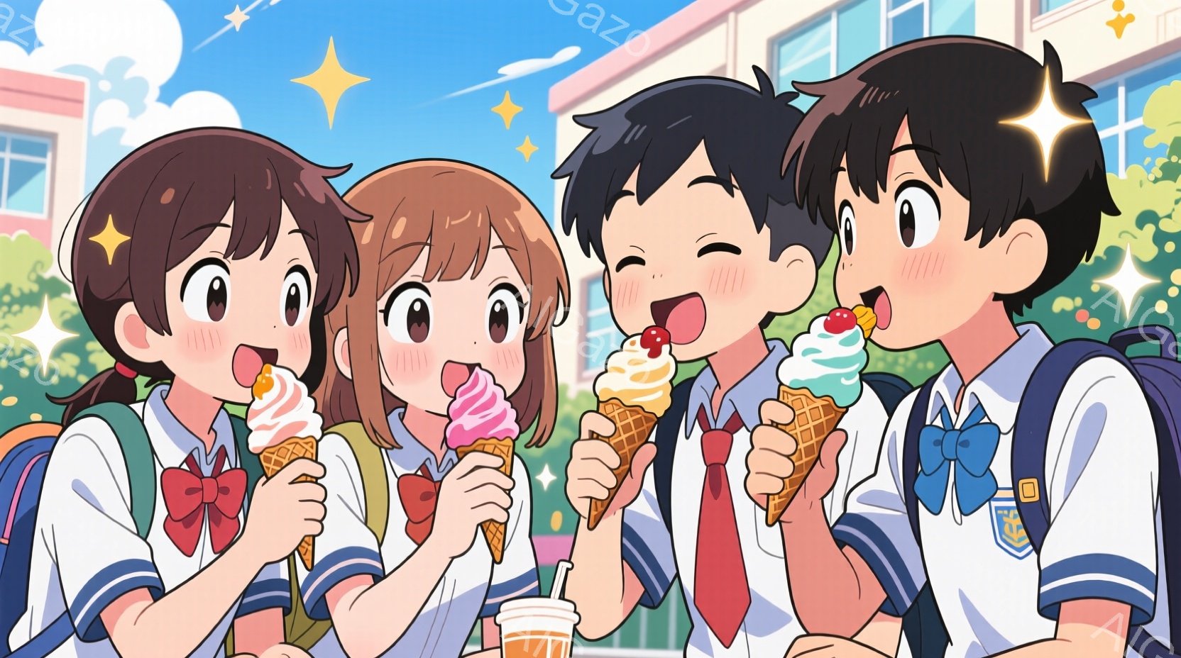 紺色の制服にネクタイとリボンを付けた、四人の高校生がアイスクリームを持っています。それぞれ表情豊かに笑顔で、楽しんでいる様子が伺えます。背景にはカラフルな建物と青空が広がり、春らしい明るい雰囲気です。