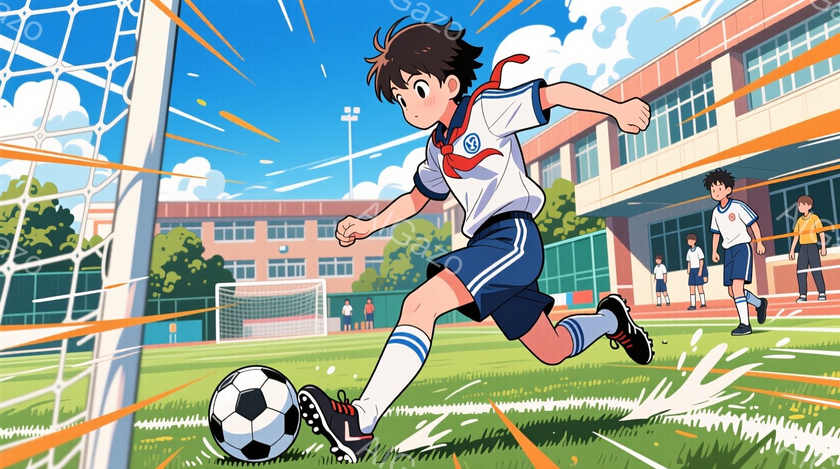 少年はサッカーボールを蹴り上げ、躍動感に満ちたポーズをとっています。彼は白いシャツに濃い青色の短パン、白いソックスと黒いスパイクを履き、短い茶色の髪をしています。背景には、青空の下、緑の芝生と建物が見え、爽やかで活気のある雰囲気です。