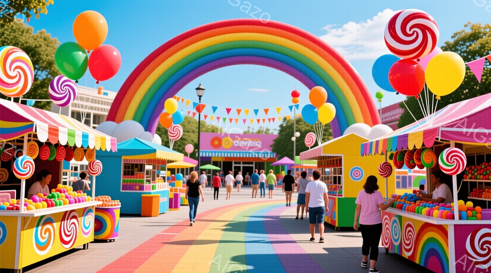 カラフルなキャンディが並ぶ屋台が並び、虹色のアーチが印象的な遊園地またはお祭りの光景です。人々はカジュアルな服装で、リラックスした様子で歩き回り、楽しんでいるようです。背景には、緑豊かな木々と青い空が広がり、明るく陽気な雰囲気が漂っています。