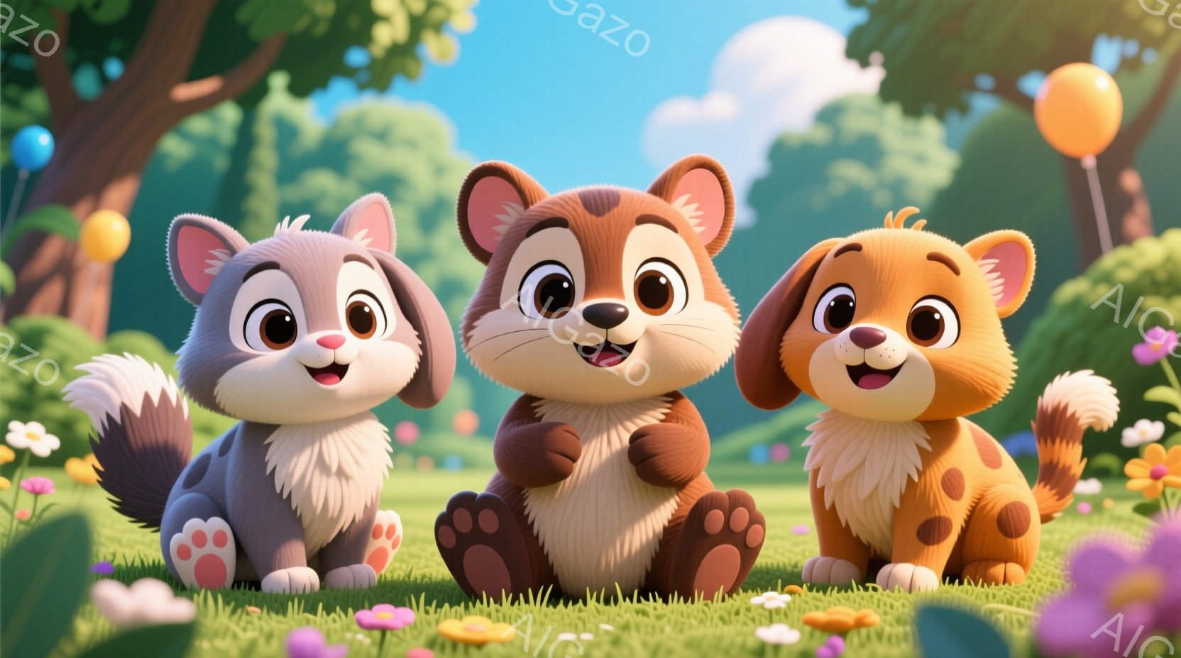 三匹の愛らしい動物たちが緑豊かな草原に並んで座っています。中央のオレンジ色の動物は赤い首輪をつけており、他の二匹はそれぞれ黒と茶色の毛並みで、皆笑顔で可愛らしい表情をしています。背景には鮮やかな花々が咲き乱れ、明るい日差しが降り注ぎ、全体的に温かく幸せな雰囲気です。