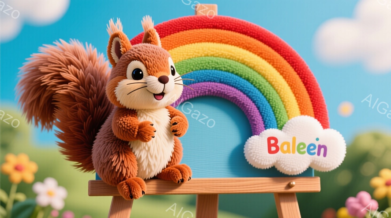 ふわふわの茶色のリスが虹色の背景の木製の看板に座っています。リスは片手を上げており、可愛らしい笑顔を浮かべています。背景には緑の丘、花、そして青空に浮かぶ白い雲が見られ、全体的に明るく、暖かく、楽しい雰囲気です。