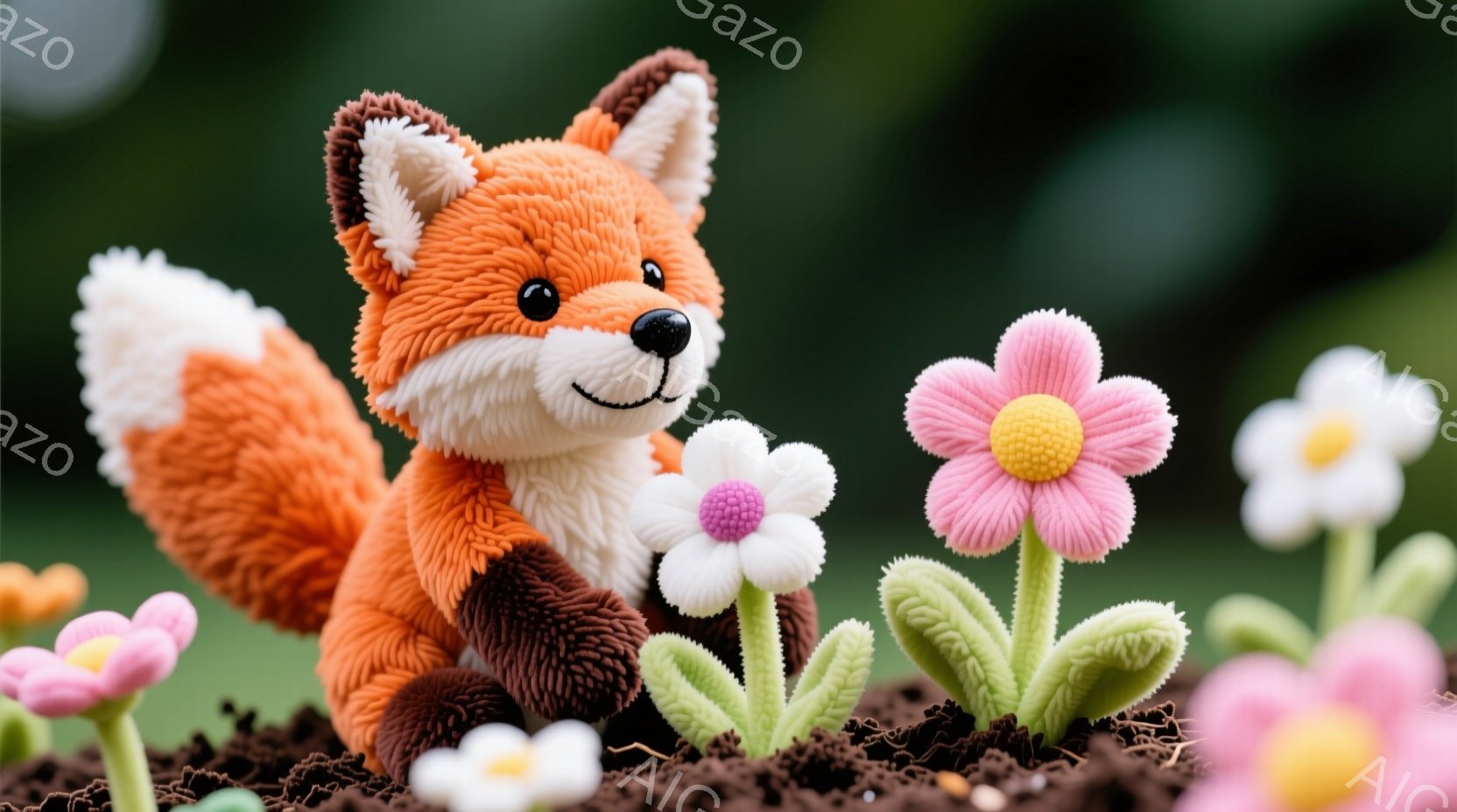 鮮やかなオレンジ色の毛並みを持つキツネが、土の中に植えられた花々に囲まれて座っています。キツネは可愛らしい笑顔で、丸い黒い目が特徴的です。背景にはぼやけた花々と緑が広がり、春らしい暖かく優しい雰囲気が漂っています。