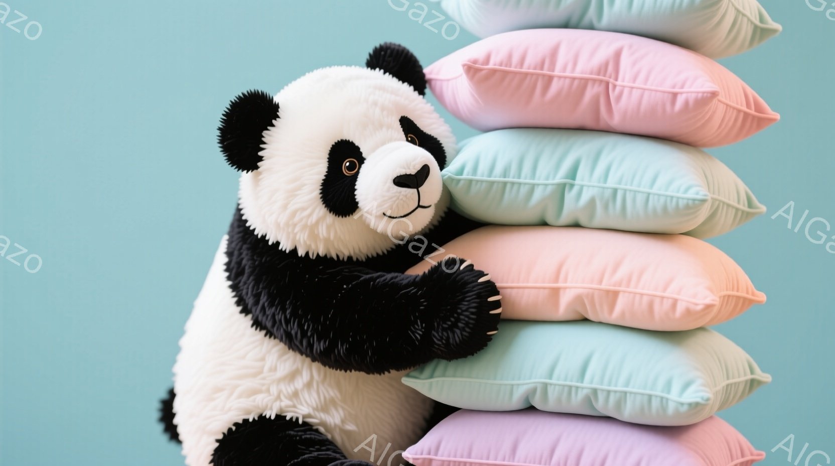 大きなパンダのぬいぐるみは、パステルカラーのクッションの山にもたれかかっており、片手を上げて楽しそうにポーズをとっています。クッションは水色、ピンク、薄紫など、柔らかい色合いで積み重ねられ、背景は淡い水色で統一感があります。全体的に穏やかで、リラックスした雰囲気が漂っています。