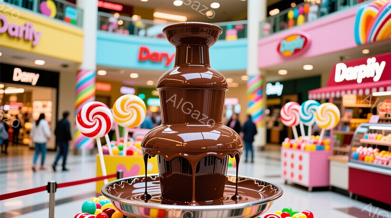 カラフルなキャンディが飾られた、チョコレートファウンテンが中央に配置されている画像です。背景には、人々が歩き回るショッピングモールの一部が見え、キャンディや甘いお菓子のディスプレイが並んでいます。全体的に、明るく楽しい雰囲気で、お祭りやイベントのような空間を連想させます。
